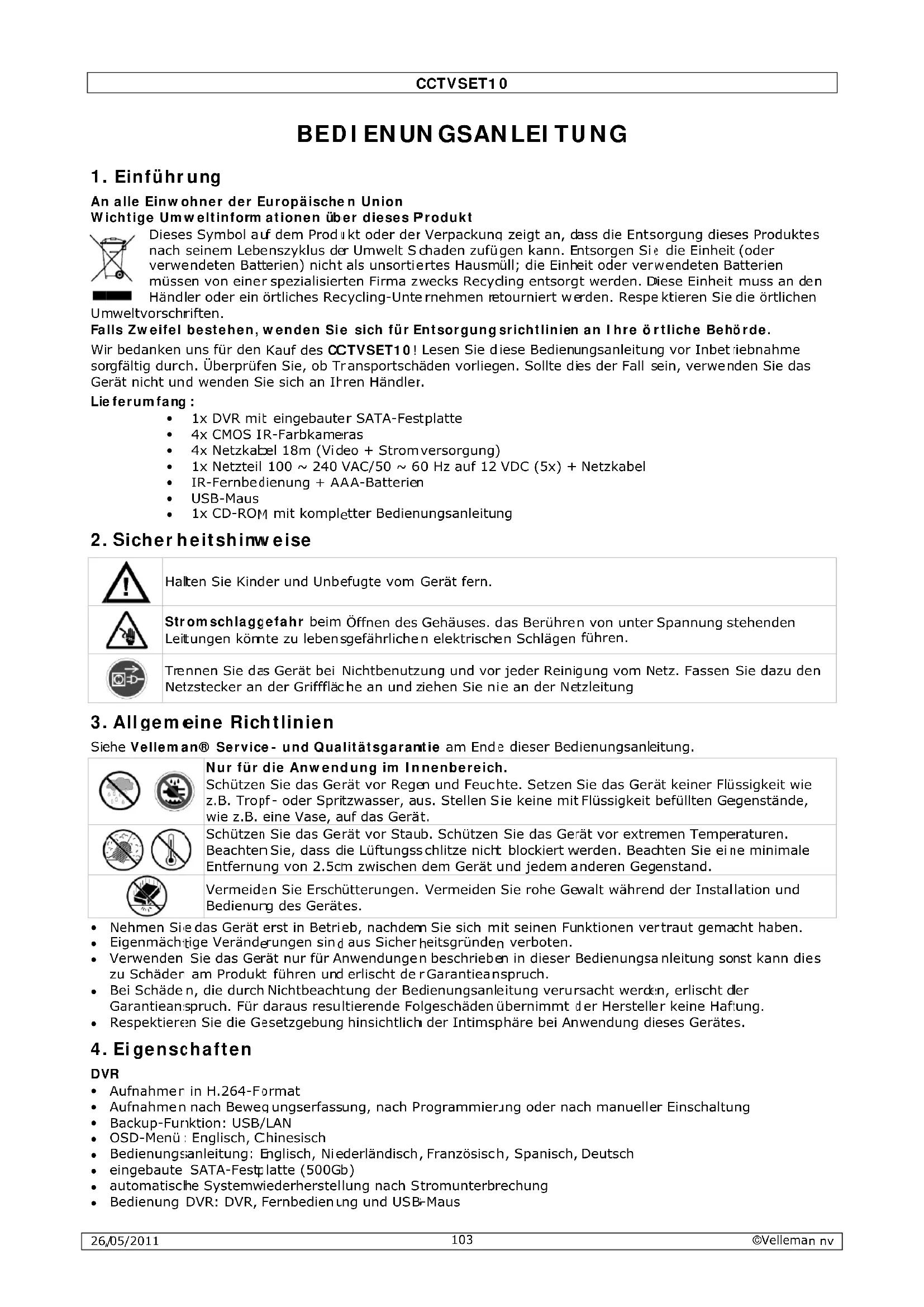 Wir bedanken uns für den Kauf des CCTVSET10! Lesen Sie diese Bedienungsanleitung vor Inbetriebnahme sorgfältig durch. Überprüfen Sie, ob Transportschäden vorliegen. Sollte dies der Fall sein, verwenden Sie das Gerät nicht und wenden Sie sich an Ihren Händler.