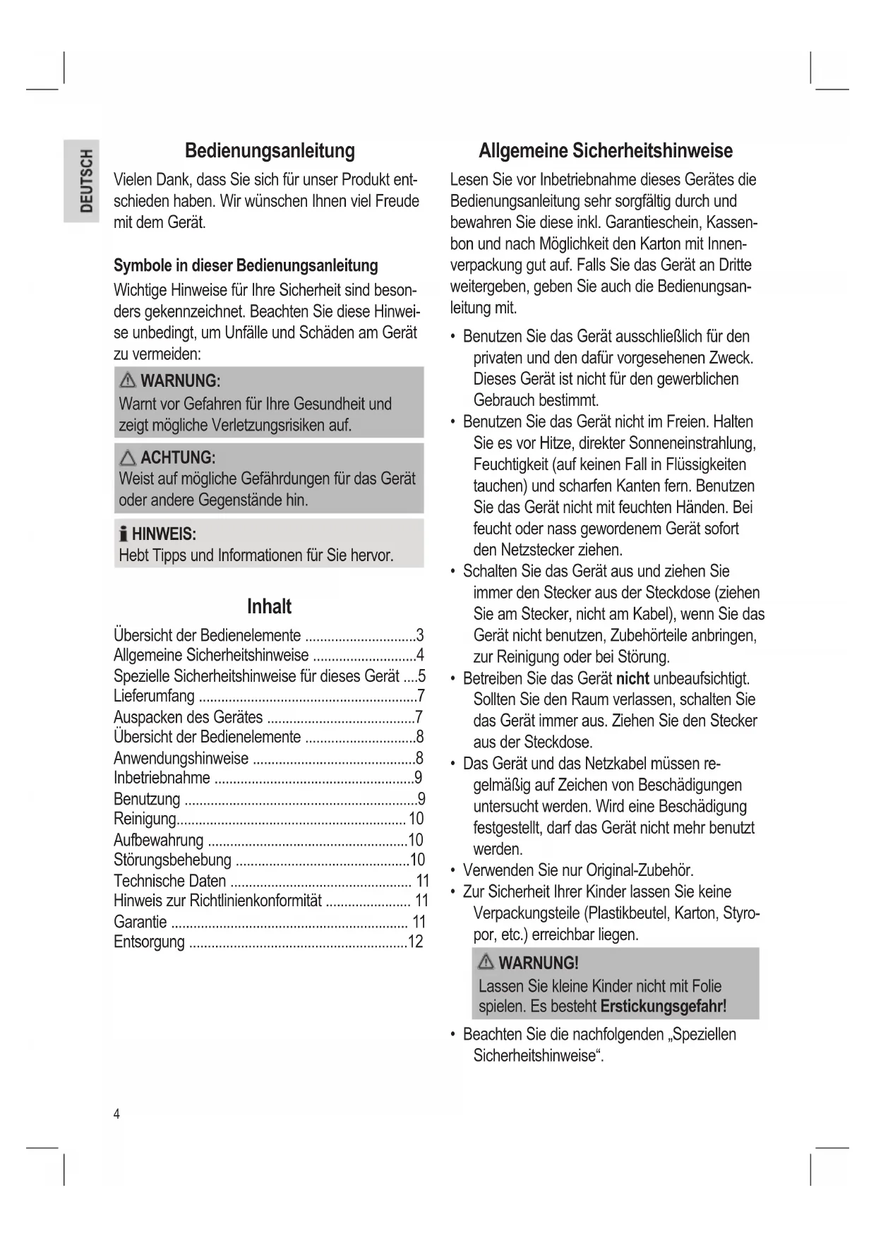 - Entsorgung Allgemeine Sicherheitshinweise Lesen Sie vor Inbetriebnahme dieses Gerätes die Bedienungsanleitung sehr sorgfältig durch und bewahren Sie diese inkl. Garantieschein, Kassen- bon und nach Möglichkeit den Karton mit Innen- verpackung gut auf. Falls Sie das Gerät an Dritte weitergeben, geben Sie auch die Bedienungsan- leitung mit. p. 12