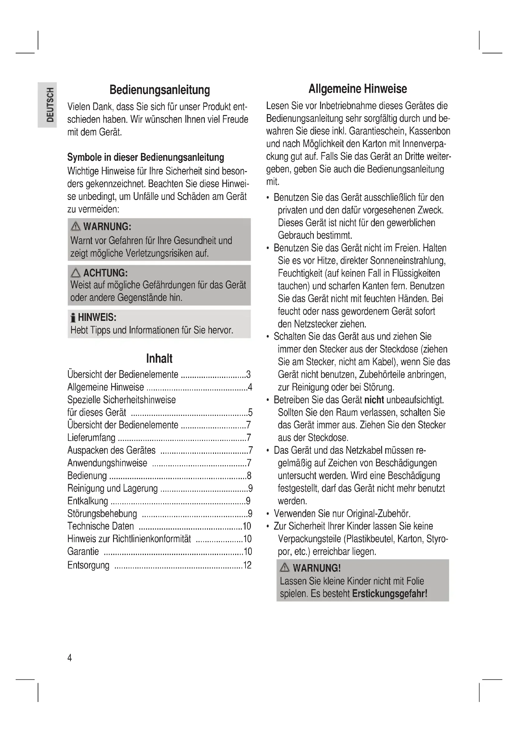 - Entsorgung Allgemeine Hinweise Lesen Sie vor Inbetriebnahme dieses Gerätes die Bedienungsanleitung sehr sorgfältig durch und be- wahren Sie diese inkl. Garantieschein, Kassenbon und nach Möglichkeit den Karton mit Innenverpa- ckung gut auf. Falls Sie das Gerät an Dritte weiter- geben, geben Sie auch die Bedienungsanleitung mit. p. 12