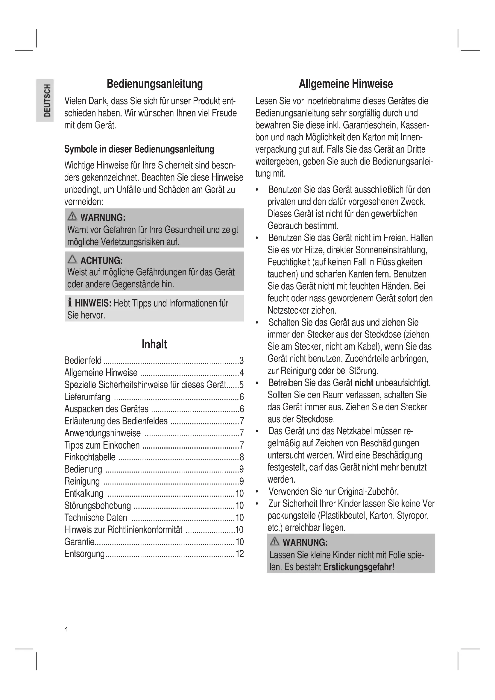- Entsorgung Allgemeine Hinweise Lesen Sie vor Inbetriebnahme dieses Gerätes die Bedienungsanleitung sehr sorgfältig durch und bewahren Sie diese inkl. Garantieschein, Kassen- bon und nach Möglichkeit den Karton mit Innen- verpackung gut auf. Falls Sie das Gerät an Dritte weitergeben, geben Sie auch die Bedienungsanlei- tung mit. p. 12