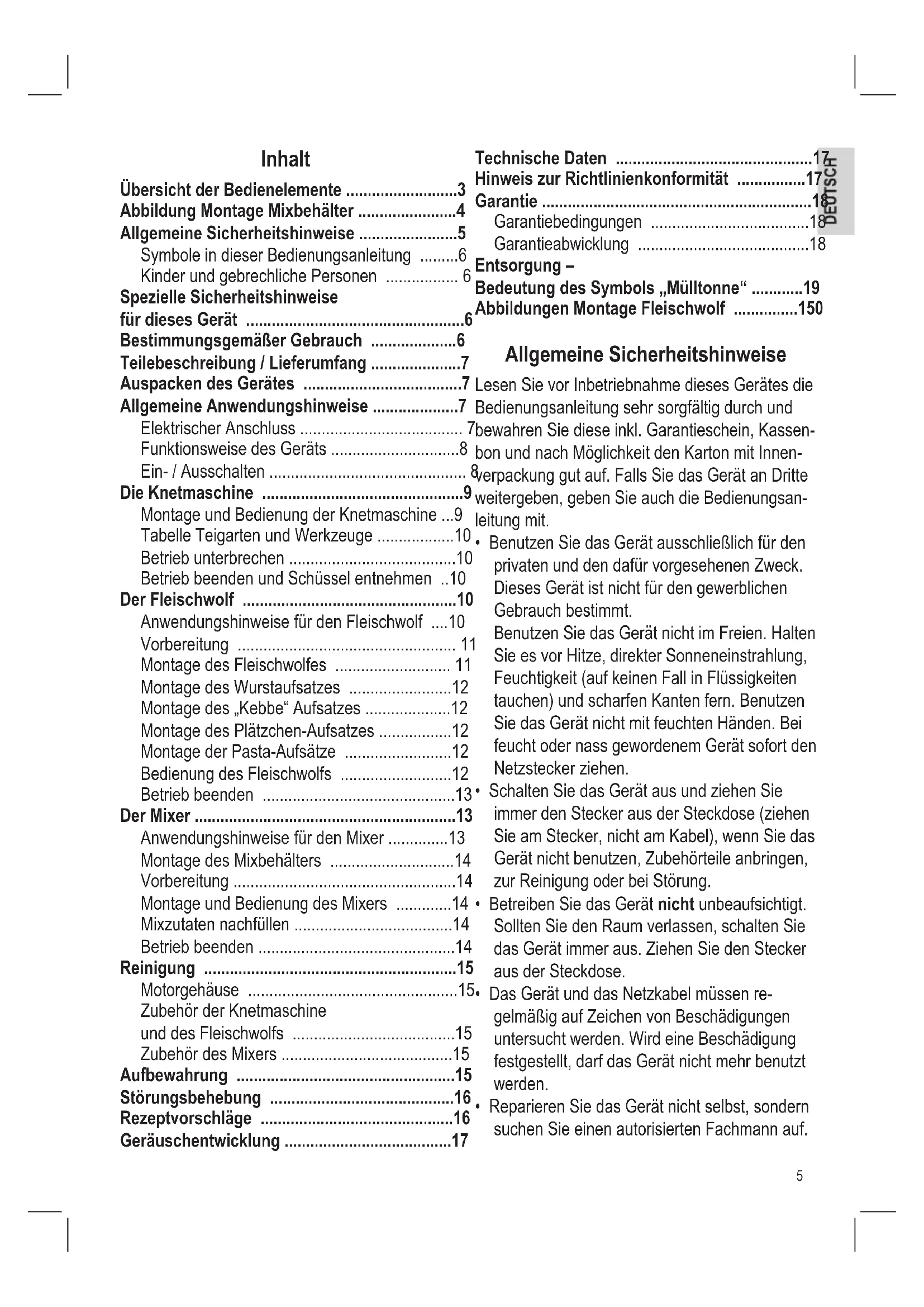 - Montage und Bedienung der Knetmaschine p. 9