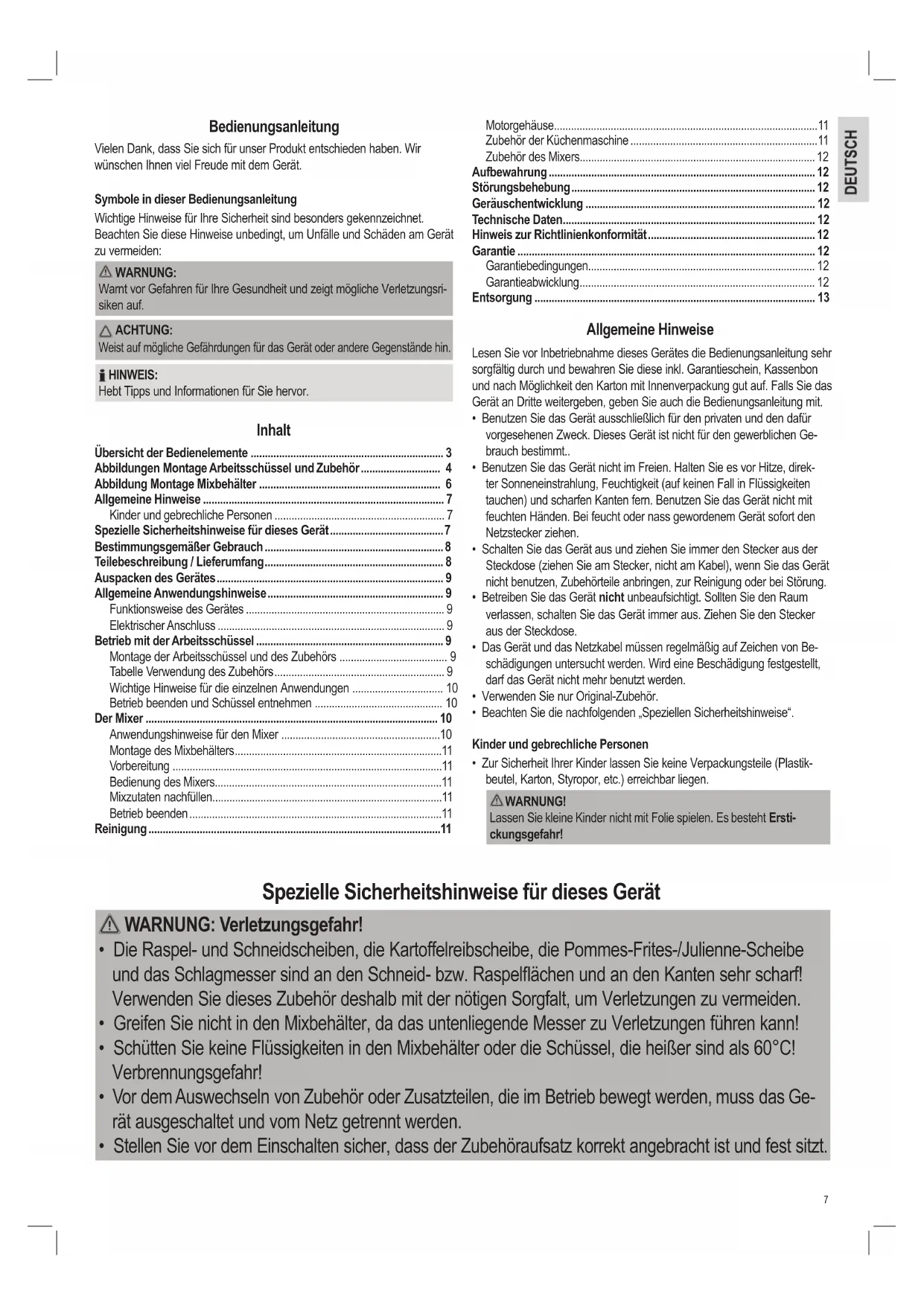 - Mixer zum Pürieren, Schlagen, Mixen. Es ist ausschließlich für diese Zwecke bestimmt und darf nur dafür verwen- det werden. Es darf nur in der Art und Weise benutzt werden, wie es in dieser Ge- brauchsanleitung beschrieben ist. Sie dürfen das Gerät nicht für gewerbliche Zwecke einsetzen. Jede andere Verwendung gilt als nicht bestimmungsgemäß und kann zu Sachschaden oder sogar zu Personenschaden führen. Der Hersteller übernimmt keine Haftung für Schäden, die durch nicht be- stimmungsgemäßen Gebrauch entstehen. Teilebeschreibung / Lieferumfang Übersicht der Bedienelemente auf Seite 3: 1 Stopfer 2 Deckel der Arbeitsschüssel mit Einfüllschacht 3 Kegel für Knet- / Rührwerkzeug oder Schlagmesser 4 Arbeitsschüssel 5 Führungsdorn 6 Antriebswelle 7 Bedienfeld 8 Motorgehäuse 9 Schneebesen-Einsatz mit Schneebesen 10 Schlagmesser 11 Pommes-Frites-/Julienne-Scheibe 12 Kartoffelreibscheibe WARNUNG: Verletzungsgefahr!