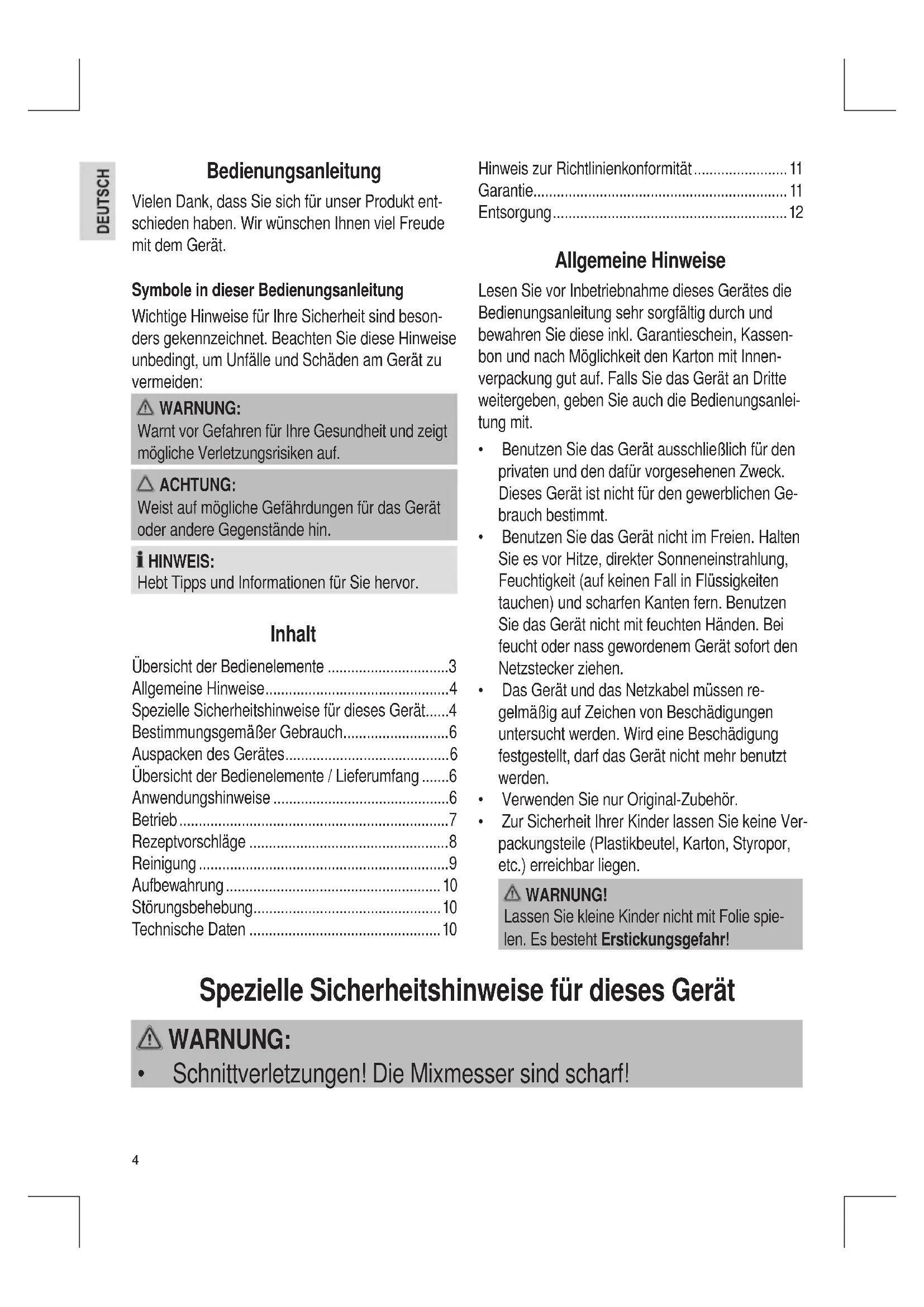 - Spezielle Sicherheitshinweise für dieses Gerät p. 4