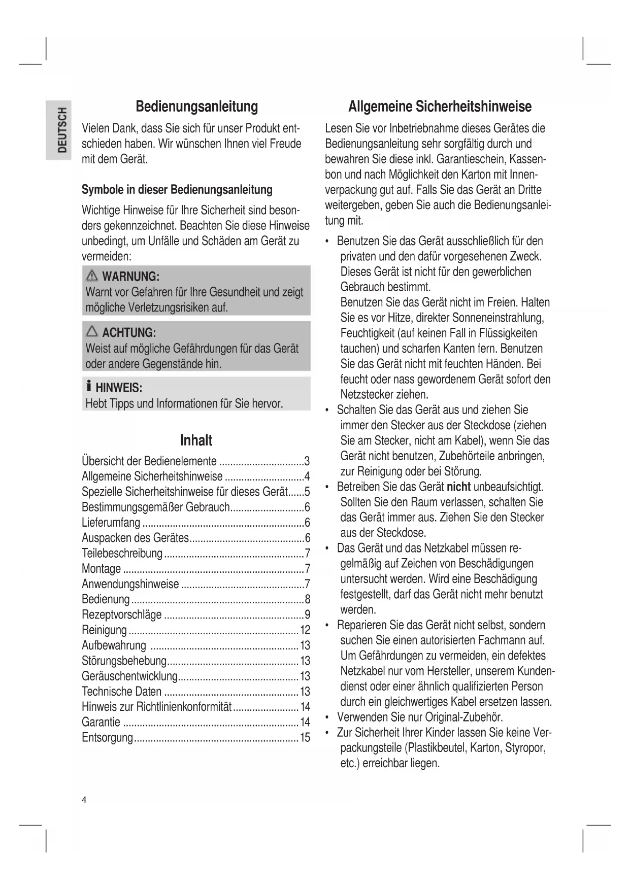 - Entsorgung Allgemeine Sicherheitshinweise Lesen Sie vor Inbetriebnahme dieses Gerätes die Bedienungsanleitung sehr sorgfältig durch und bewahren Sie diese inkl. Garantieschein, Kassen- bon und nach Möglichkeit den Karton mit Innen- verpackung gut auf. Falls Sie das Gerät an Dritte weitergeben, geben Sie auch die Bedienungsanlei- tung mit. p. 15