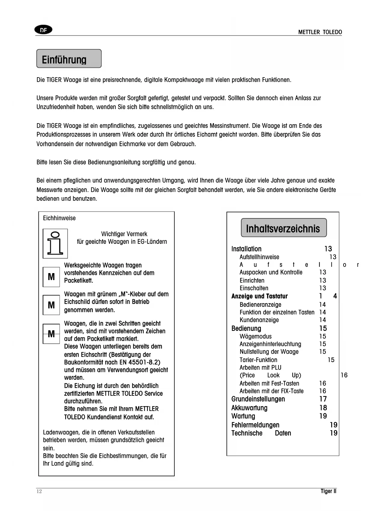 Bedieneranzeige 14 Funktion der einzelnen Tasten 14 Kundenanzeige 14 Bedienung 15 Wägemodus 15 Anzeigenhinterleuchtung 15 Nullstellung der Waage 15 Tarier-Funktion 15 Arbeiten mit PLU (Price Look Up) 16 Arbeiten mit Fest-Tasten 16 Arbeiten mit der FIX-Taste 16 Grundeinstellungen 17 Akkuwartung 18 Wartung 19 Fehlermeldungen 19 Technische Daten 19 InhaltsverzeichnisMETTLER TOLEDO Tiger II 13