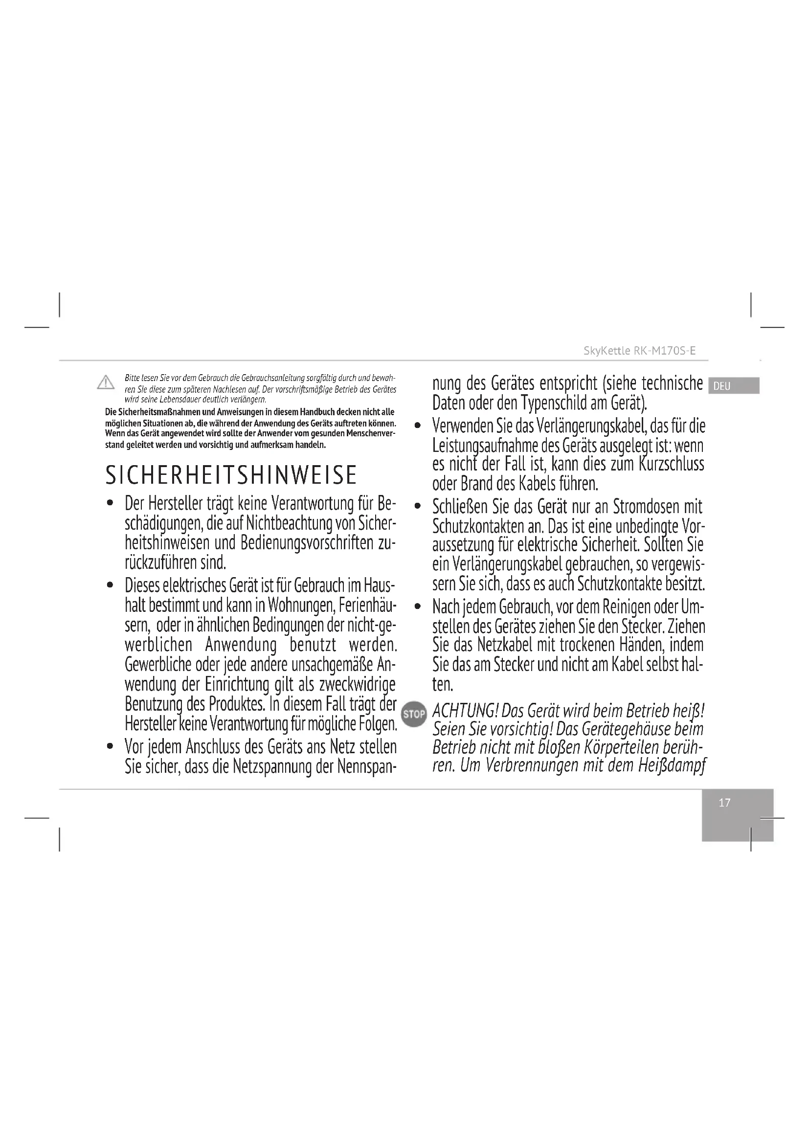 Dieses Gerät darf von Kindern ab 8 Jahren benutzt werden. Außerdem dürfen es unter bestimmten Vor- aussetzungen Menschen mit verminderten körperli- chen, sensorischen oder geistigen Fähigkeiten und mangelnder Erfahrung sowie fehlenden Kenntnissen in seinem Gebrauch anwenden: Sie müssen bei der Nutzung beaufsichtigt warden oder in dem sicherenSkyKettle RK-M170S-E