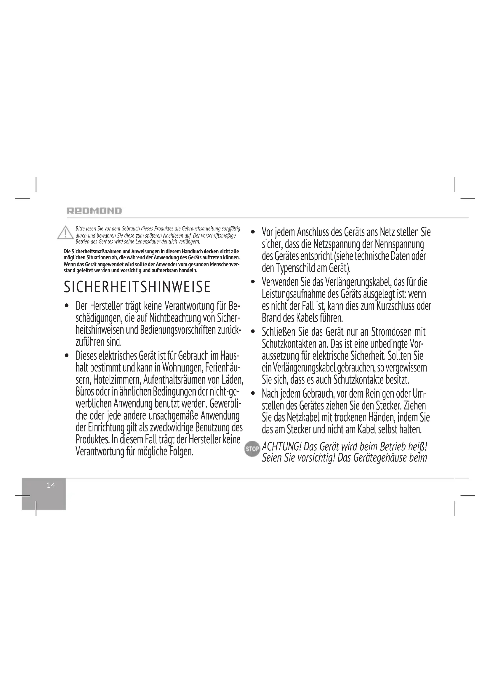 Finden Sie kostenlos die Bedienungsanleitung des Geräts RKG176E Redmond als PDF.