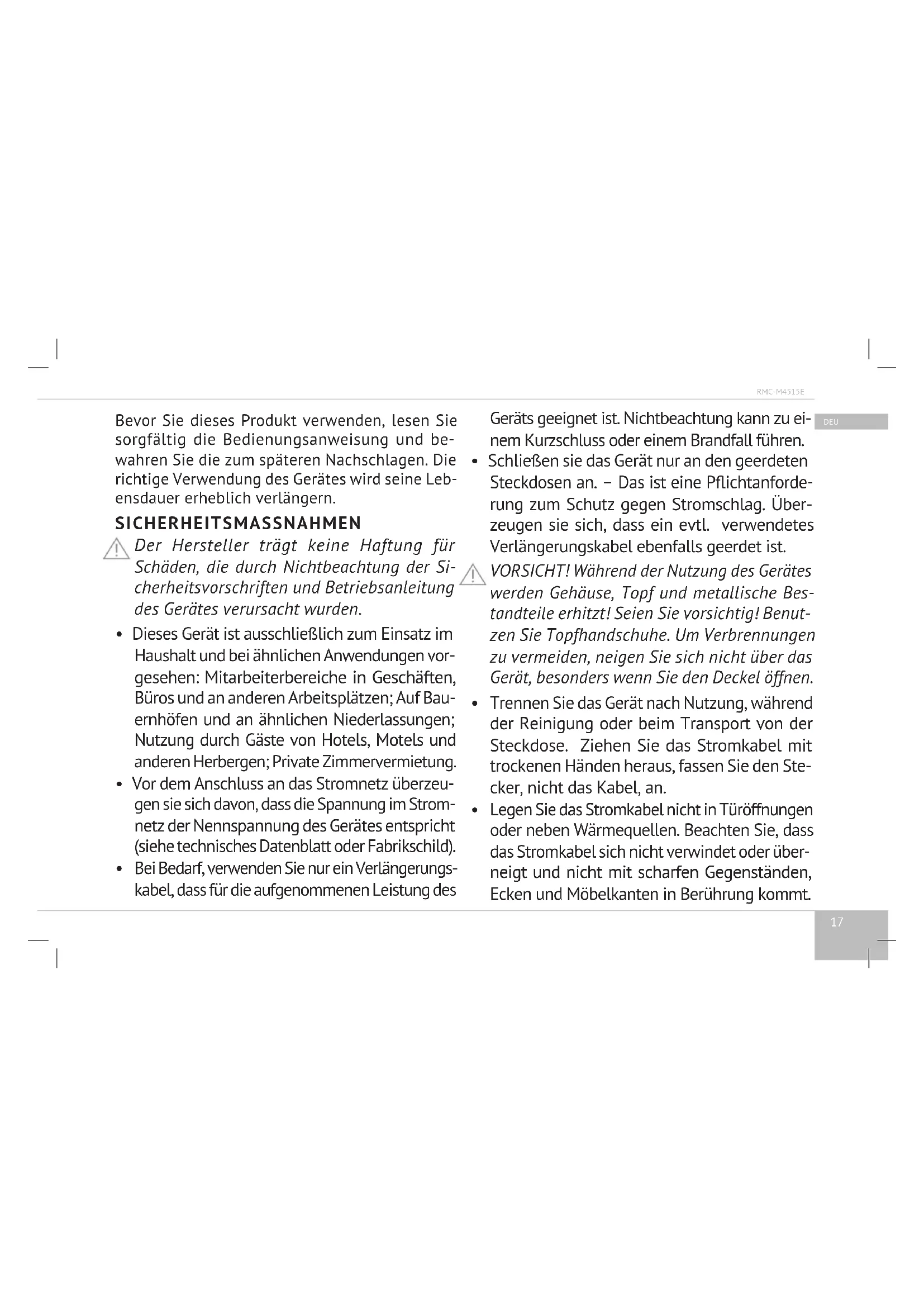 - Die Reparatur des Gerätes in Eigenregie oder die Änderungen seiner Konstruktion sind ver- boten. Alle Bedienungs- und Reparaturarbeiten müssen durch ein autorisiertes Serviceperso- nal ausgeführt werden. Die nicht professionell ausgeführte Arbeit kann zu Gerätstörungen, Verletzungen und Eigentumsschäden führen.19 RMC-M4515E DEU Spezikation Modell ...................................................................................................... RMC-M4515E Leistung ................................................................................................................. 700 W Spannung ........................................................................................ 220–240 V, 50 Hz Topffassungsvermögen ............................................................................................ 4 l Topfbeschichtung .............................................Antihaftbeschichtung keramisch Display ......................................................................................................... LED, digital Dampfauslassventil ...................................................................................abnehmbar Zubereitungsprogramme
