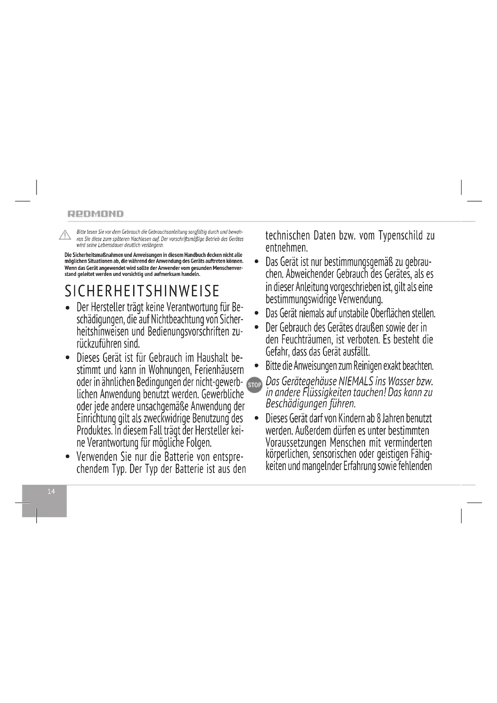 Zum Reinigen des Gerätes verwenden Sie keine scheuernden und alkoholischen Reini- gungsmittel, Metallbürsten u.s.w. Die Trittäche mit feuchtem weichem Tuch abwischen, anschließend trockenwischen. Das Grundgerät NIEMALS ins Wasser tauchen und nie unter ießendes Wasser halten. Das Gerät ist nicht zum Reinigen im Geschirrspüler geeignet. Vor einer längeren Lagerung entnehmen Sie die Batterien aus dem Gerät. Bewahren Sie das Gerät in einem trockenen, belüfteten Ort auf, fern von heizenden Geräten oder direktem Sonnenlicht. Während des Transports oder der Aufbewahrung, setzten Sie das Gerät nicht unter mechanischen Einuss, das kann zu Schäden des Geräts führen oder des Packungs- inhalts. Halten Sie die Geräteverpackung fern von Wasser und heissen Flüssigkeiten. Für die mindest unterstützte OS version sehen Sie bitte auf der ofziellen Website www. redmond.company oder in der Applikationsbeschreibung im App Store und Google Play nach.
