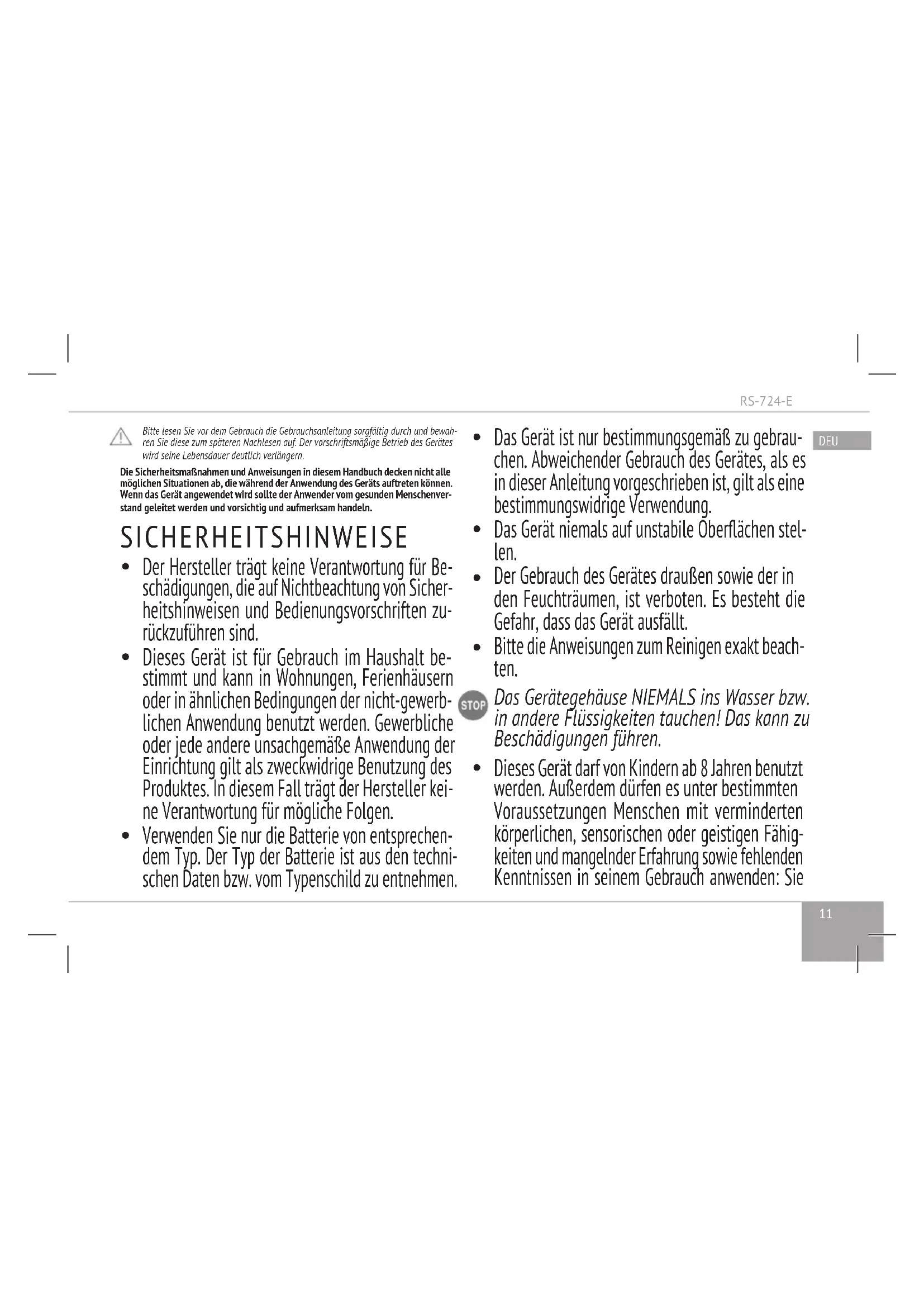 Die eigenmächtigen Reparaturen bzw. Änderungen am Gerät sind verboten. Das Gerät ausschließlich durch den autorisierten Kundendienst reparieren lassen. Unsachgemäß durchgeführte Arbeit kann zum Ausfall des Gerätes, zur Verletzungen und Sachschäden führen. zum Ausfall des Gerätes, zur Verletzungen und Sachschäden führen. ACHTUNG! Das Gerät nur im technisch ein- wandfreien Zustand benutzen.RS-724-E