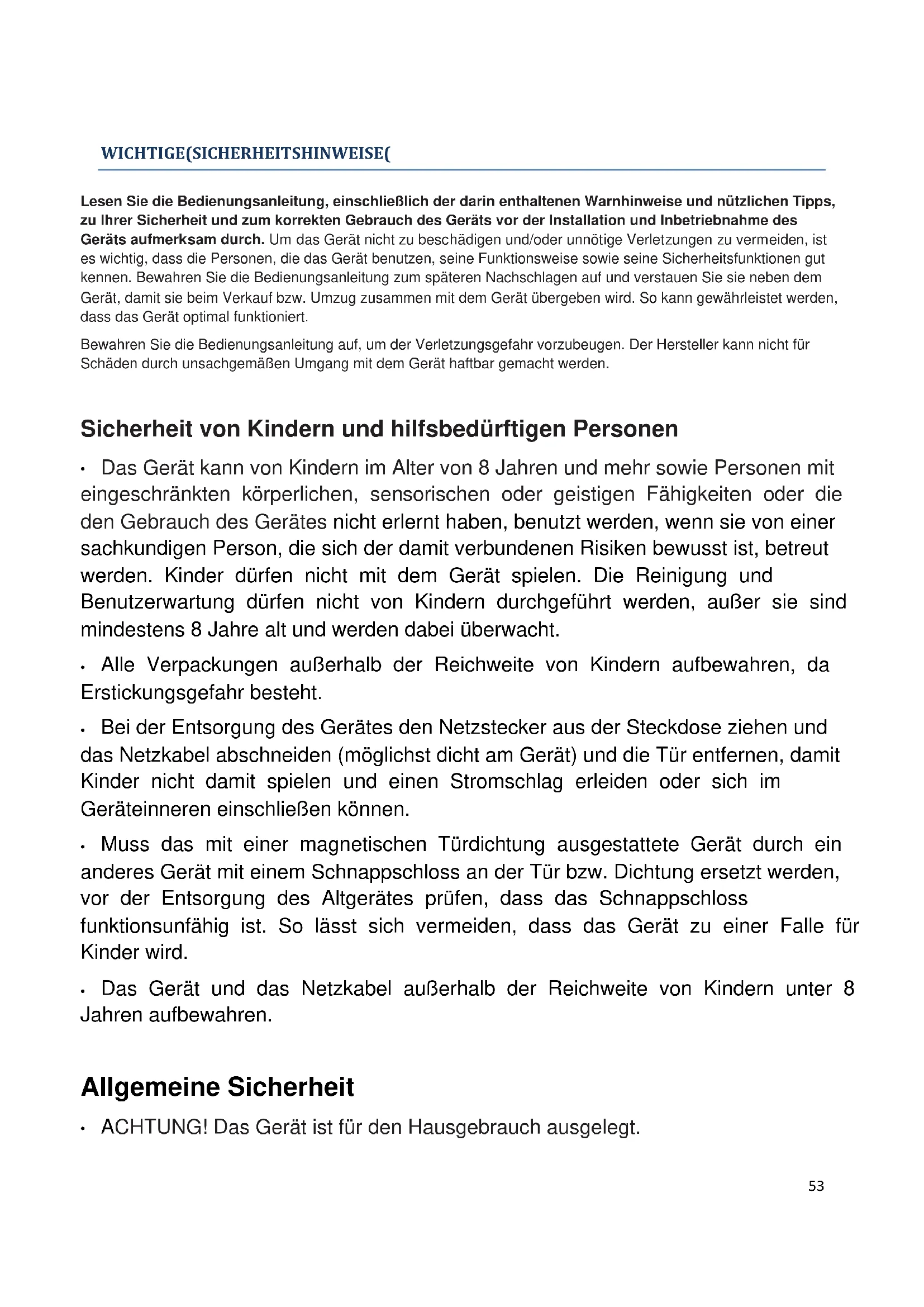 - Bei der Entsorgung des Gerätes den Netzstecker aus der Steckdoseziehen und das Netzkabel abschreiben (möglichst dicht am Gerät) und die Tur entfernen, damit Kinder nicht damitspielern und einen Stromschlag erleiden oder sich im Geräteinneren einschließlich konnen.