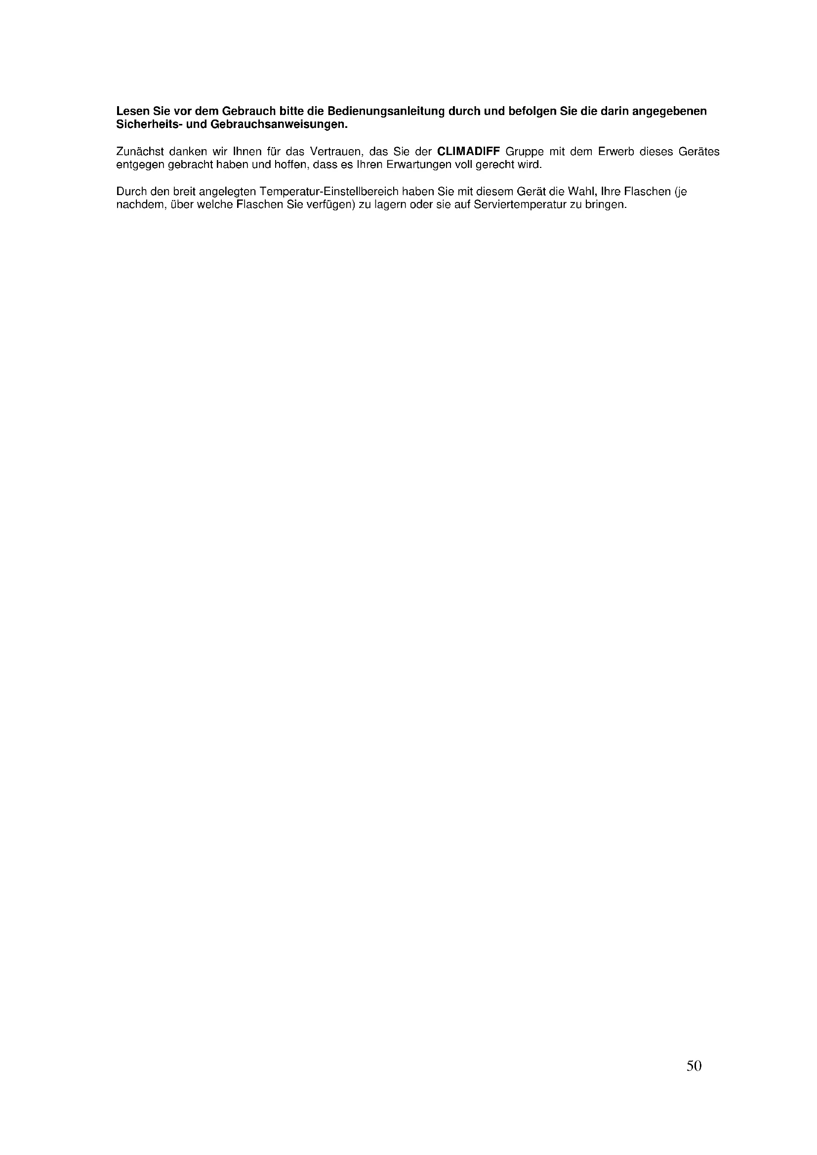 Dieses Gerat ist ausschließlich für den privaten Hausgebrauch und die Temperierung von Wein oder, falls this gewünscht wird, anderer Getränke bestimmt. Es ist jeder keinesfalls zum Aufbewahren von Lebensmitteln vorgesehen.