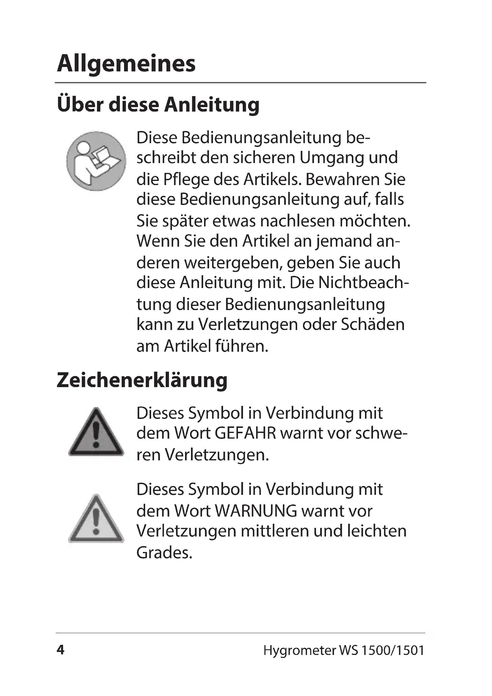 - Entsorgen Hygrometer WS 1500/1501 Allgemeines Über diese Anleitung Diese Bedienungsanleitung be- schreibt den sicheren Umgang und die Pflege des Artikels. Bewahren Sie diese Bedienungsanleitung auf, falls Sie später etwas nachlesen möchten. Wenn Sie den Artikel an jemand an- deren weitergeben, geben Sie auch diese Anleitung mit. Die Nichtbeach- tung dieser Bedienungsanleitung kann zu Verletzungen oder Schäden am Artikel führen. Zeichenerklärung Dieses Symbol in Verbindung mit dem Wort GEFAHR warnt vor schwe- ren Verletzungen. Dieses Symbol in Verbindung mit dem Wort WARNUNG warnt vor Verletzungen mittleren und leichten Grades.5 Hygrometer WS 1500/1501 Deutsch Dieses Symbol in Verbindung mit dem Wort HINWEIS warnt vor Sach- schäden. Dieses Symbol kennzeichnet zusätz- liche Informationen und allgemeine Hinweise. Bestimmungsgemäßer Gebrauch Dieses Hygrometer dient zur Messung von Raumtemperatur und Luftfeuchtigkeit und damit zur Kontrolle des Raumklimas. Für die gewerbliche Nutzung ist das Hygro- meter ungeeignet. Sicherheit Dieser Artikel kann von Kindern ab 8 Jahren und darüber sowie von Personen mit verringerten physischen, sensorischen oder mentalen Fähigkeiten oder Mangel an Erfahrung und Wissen benutzt6 Hygrometer WS 1500/1501 werden, wenn sie beaufsichtigt oder bezüglich des sicheren Gebrauchs des Artikels unterwie- sen wurden und die daraus resul- tierenden Gefahren verstehen. Kinder dürfen nicht mit dem Arti- kel spielen. Reinigung und Benutzerwartung dürfen nicht von Kindern vorge- nommen werden, es sei denn, sie sind 8 Jahre oder älter und werden beaufsichtigt. Batterien können bei Verschlucken lebensgefährlich sein. Bewahren Sie Gerät und Batterien deshalb für Kleinkinder unerreichbar auf. Wurde eine Batterie verschluckt, muss sofort medizinische Hilfe in Anspruch genommen werden.7 Hygrometer WS 1500/1501 Deutsch GEFAHR für Kinder Halten Sie Kinder von Verpackungsmaterial fern. Bei Verschlucken besteht Erstickungsgefahr. Achten Sie auch darauf, dass der Verpackungsbeutel nicht über den Kopf gestülpt wird. GEFAHR von Brand/Verbrennung und/ oder Explosion Explosionsgefahr bei unsachgemäßem Aus- wechseln der Batterien. Ersetzen Sie Batterien nur durch denselben oder einen gleichwer- tigen Batterietyp. Beachten Sie die „Techni- schen Daten“. Batterien dürfen nicht geladen, mit anderen Mitteln reaktiviert, auseinander genommen, ins Feuer geworfen oder kurzgeschlossen werden. Ansonsten besteht erhöhte Explosi- ons- und Auslaufgefahr, außerdem können Gase entweichen! Vermeiden Sie Kontakt der Batterieüssigkeit mit Haut, Augen und Schleimhäuten. Bei Kontakt spülen Sie die betroenen Stel- len sofort mit reichlich klarem Wasser und suchen Sie umgehend einen Arzt auf.8 Hygrometer WS 1500/1501 VORSICHT vor Sachschäden Tauchen Sie den Artikel nicht Wasser oder andere Flüssigkeiten. Schützen Sie den Artikel vor starken Stößen und Erschütterungen. Nehmen Sie die Batterien aus Gerät heraus, wenn diese verbraucht sind oder wenn Sie das Gerät länger nicht benutzen. So ver- meiden Sie Schäden, die durch Auslaufen entstehen können. Achten Sie beim Einsetzen und Wechseln der Batterien auf die richtige Polarität(+/-). Setzen Sie die Batterien keinen extremen Bedingungen aus, indem Sie diese z. B. auf Heizkörpern oder unter direkter Sonnenein- strahlung lagern. Erhöhte Auslaufgefahr! Reinigen Sie Batterie- und Gerätekontakte bei Bedarf vor dem Einlegen. Setzen Sie nur Batterien des gleichen Typs ein, verwenden Sie keine unterschiedlichen Typen oder gebrauchte und neue Batterien miteinander.9 Hygrometer WS 1500/1501 Deutsch Nehmen Sie keine Veränderungen an dem Artikel vor. Lassen Sie Reparaturen nur von einer Fachwerkstatt durchführen. Unsach- gemäß durchgeführte Reparaturen können erhebliche Gefährdungen für den Benutzer verursachen. Hinweise zum Standort GEFAHR von schweren Verletzungen − Bei der Wandinstallation dürfen am Montageort keine elektrischen Kabel, Gas- oder Wasserrohre in der Wand verlegt sein. Beim Boh- ren der Löcher besteht ansonsten Stromschlaggefahr! Das Gerät verfügt auf der Rückseite über einen ausklappbaren Fuß sowie eine Aufhän- ge-Öse für die Wandbefestigung. Wählen Sie möglichst einen Standort, bei dem das Gerät nicht der direkten Sonnenein- strahlung ausgesetzt ist.10 Hygrometer WS 1500/1501 Auf einen Blick p. 224