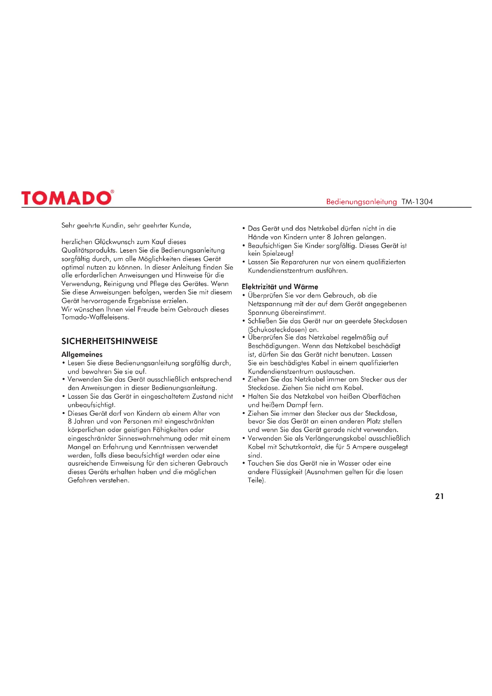 - TOMADO cannot be held responsible for any material damage or personal accident resulting from connecting Warranty regulations21 Sehr geehrte Kundin, sehr geehrter Kunde, herzlichen Glückwunsch zum Kauf dieses Qualitätsprodukts. Lesen Sie die Bedienungsanleitung sorgfältig durch, um alle Möglichkeiten dieses Gerät optimal nutzen zu können. In dieser Anleitung finden Sie alle erforderlichen Anweisungen und Hinweise für die Verwendung, Reinigung und Pflege des Gerätes. Wenn Sie diese Anweisungen befolgen, werden Sie mit diesem Gerät hervorragende Ergebnisse erzielen. Wir wünschen Ihnen viel Freude beim Gebrauch dieses Tomado-Waffeleisens. SICHERHEITSHINWEISE Allgemeines