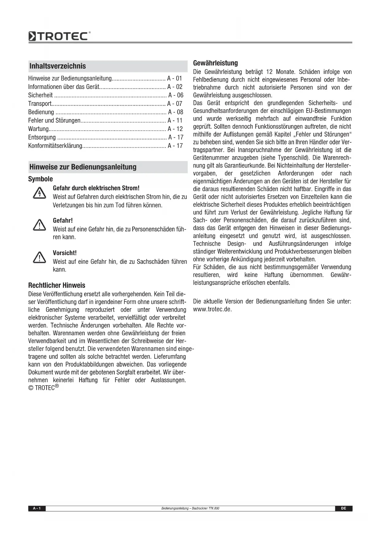 Gewährleistung Die Gewährleistung beträgt 12 Monate. Schäden infolge von Fehlbedienung durch nicht eingewiesenes Personal oder Inbe- triebnahme durch nicht autorisierte Personen sind von der Gewährleistung ausgeschlossen. Das Gerät entspricht den grundlegenden Sicherheits- und Gesundheitsanforderungen der einschlägigen EU-Bestimmungen und wurde werkseitig mehrfach auf einwandfreie Funktion geprüft. Sollten dennoch Funktionsstörungen auftreten, die nicht mithilfe der Auflistungen gemäß Kapitel „Fehler und Störungen“ zu beheben sind, wenden Sie sich bitte an Ihren Händler oder Ver- tragspartner. Bei Inanspruchnahme der Gewährleistung ist die Gerätenummer anzugeben (siehe Typenschild). Die Warenrech- nung gilt als Garantieurkunde. Bei Nichteinhaltung der Hersteller- vorgaben, der gesetzlichen Anforderungen oder nach eigenmächtigen Änderungen an den Geräten ist der Hersteller für die daraus resultierenden Schäden nicht haftbar. Eingriffe in das Gerät oder nicht autorisiertes Ersetzen von Einzelteilen kann die elektrische Sicherheit dieses Produktes erheblich beeinträchtigen und führt zum Verlust der Gewährleistung. Jegliche Haftung für Sach- oder Personenschäden, die darauf zurückzuführen sind, dass das Gerät entgegen den Hinweisen in dieser Bedienungs- anleitung eingesetzt und genutzt wird, ist ausgeschlossen. Technische Design- und Ausführungsänderungen infolge ständiger Weiterentwicklung und Produktverbesserungen bleiben ohne vorherige Ankündigung jederzeit vorbehalten. Für Schäden, die aus nicht bestimmungsgemäßer Verwendung resultieren, wird keine Haftung übernommen. Gewähr- leistungsansprüche erlöschen ebenfalls. Die aktuelle Version der Bedienungsanleitung finden Sie unter: www.trotec.de. Inhaltsverzeichnis Hinweise zur Bedienungsanleitung.................................. A - 01 Informationen über das Gerät.......................................... A - 02 Sicherheit ....................................................................... A - 06 Transport........................................................................ A - 07 Bedienung ...................................................................... A - 08 Fehler und Störungen...................................................... A - 11 Wartung.......................................................................... A - 12 Entsorgung ..................................................................... A - 17 Konformitätserklärung..................................................... A - 17 Hinweise zur BedienungsanleitungDE Bedienungsanleitung – Bautrockner TTK 800 A - 2 Gerätebeschreibung Mithilfe des Kondensationsprinzips sorgt das Gerät für eine automatische Luftentfeuchtung von Räumen. Hierzu kann das Gerät im Dauerbetrieb verwendet werden. Der Ventilator saugt die feuchte Raumluft am Lufteinlass (2) über den Luftfilter (3), den Verdampfer und dem dahinterliegenden Kondensator an. Am kalten Verdampfer wird die Raumluft bis unter den Taupunkt abgekühlt. Der in der Luft enthaltene Was- serdampf schlägt sich als Kondensat bzw. Reif auf den Ver- dampferlamellen nieder. Am Kondensator wird die entfeuchtete, abgekühlte Luft wieder erwärmt und über den Luftauslass (6) aus- geblasen. Die so aufbereitete, trockenere Luft wird wieder mit der Raumluft vermischt. Aufgrund der ständigen Raumluftzirkulation durch das Gerät wird die Luftfeuchtigkeit im Aufstellungsraum reduziert. Abhängig von der Lufttemperatur und der relativen Luft- feuchtigkeit tropft das kondensierte Wasser stetig oder nur wäh- rend der periodischen Abtauphasen in die Kondensatwanne. Über eine druckfeste Rohrverbindung wird das Kondensat mithilfe des vormontierten Kondensatablassschlauches (5) aus dem Gerät gefördert. Optional kann das kondensierte Wasser mithilfe einer nachrüstba- ren Kondensatpumpe abgeleitet werden. Das Gerät ist zum Transport mit einer Griff-Bügelstange (1) und Transportrollen (4) versehen. In Arbeitsposition steht das Gerät gekippt auf dem Standbügel (7). Das Gerät ermöglicht eine Absenkung der relativen Luftfeuch- tigkeit auf bis zu ca. 35 %. Aufgrund der im Betrieb entwickelten Wärmeabstrahlung kann die Zimmertemperatur um ca. 1-3 °C ansteigen. Gerätedarstellung und Bedienelemente Lieferumfang (standard)