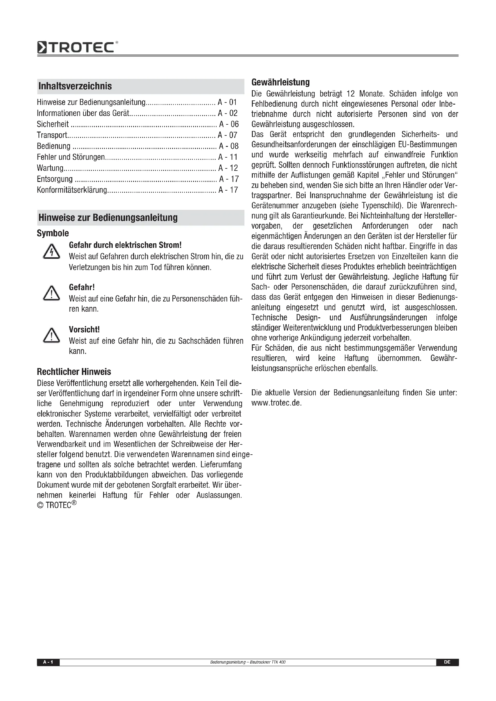 Gewährleistung Die Gewährleistung beträgt 12 Monate. Schäden infolge von Fehlbedienung durch nicht eingewiesenes Personal oder Inbe- triebnahme durch nicht autorisierte Personen sind von der Gewährleistung ausgeschlossen. Das Gerät entspricht den grundlegenden Sicherheits- und Gesundheitsanforderungen der einschlägigen EU-Bestimmungen und wurde werkseitig mehrfach auf einwandfreie Funktion geprüft. Sollten dennoch Funktionsstörungen auftreten, die nicht mithilfe der Auflistungen gemäß Kapitel „Fehler und Störungen“ zu beheben sind, wenden Sie sich bitte an Ihren Händler oder Ver- tragspartner. Bei Inanspruchnahme der Gewährleistung ist die Gerätenummer anzugeben (siehe Typenschild). Die Warenrech- nung gilt als Garantieurkunde. Bei Nichteinhaltung der Hersteller- vorgaben, der gesetzlichen Anforderungen oder nach eigenmächtigen Änderungen an den Geräten ist der Hersteller für die daraus resultierenden Schäden nicht haftbar. Eingriffe in das Gerät oder nicht autorisiertes Ersetzen von Einzelteilen kann die elektrische Sicherheit dieses Produktes erheblich beeinträchtigen und führt zum Verlust der Gewährleistung. Jegliche Haftung für Sach- oder Personenschäden, die darauf zurückzuführen sind, dass das Gerät entgegen den Hinweisen in dieser Bedienungs- anleitung eingesetzt und genutzt wird, ist ausgeschlossen. Technische Design- und Ausführungsänderungen infolge ständiger Weiterentwicklung und Produktverbesserungen bleiben ohne vorherige Ankündigung jederzeit vorbehalten. Für Schäden, die aus nicht bestimmungsgemäßer Verwendung resultieren, wird keine Haftung übernommen. Gewähr- leistungsansprüche erlöschen ebenfalls. Die aktuelle Version der Bedienungsanleitung finden Sie unter: www.trotec.de. Inhaltsverzeichnis Hinweise zur Bedienungsanleitung.................................. A - 01 Informationen über das Gerät.......................................... A - 02 Sicherheit ....................................................................... A - 06 Transport........................................................................ A - 07 Bedienung ...................................................................... A - 08 Fehler und Störungen...................................................... A - 11 Wartung.......................................................................... A - 12 Entsorgung ..................................................................... A - 17 Konformitätserklärung..................................................... A - 17 Hinweise zur BedienungsanleitungDE Bedienungsanleitung – Bautrockner TTK 400 A - 2 Gerätebeschreibung Mithilfe des Kondensationsprinzips sorgt das Gerät für eine automatische Luftentfeuchtung von Räumen. Hierzu kann das Gerät im Dauerbetrieb verwendet werden. Der Ventilator saugt die feuchte Raumluft am Lufteinlass (2) über den Luftfilter (5), den Verdampfer und dem dahinterliegenden Kondensator an. Am kalten Verdampfer wird die Raumluft bis unter den Taupunkt abgekühlt. Der in der Luft enthaltene Was- serdampf schlägt sich als Kondensat bzw. Reif auf den Ver- dampferlamellen nieder. Am Kondensator wird die entfeuchtete, abgekühlte Luft wieder erwärmt und über den Luftauslass (8) aus- geblasen. Die so aufbereitete, trockenere Luft wird wieder mit der Raumluft vermischt. Aufgrund der ständigen Raumluftzirkulation durch das Gerät wird die Luftfeuchtigkeit im Aufstellungsraum reduziert. Abhängig von der Lufttemperatur und der relativen Luft- feuchtigkeit tropft das kondensierte Wasser stetig oder nur wäh- rend der periodischen Abtauphasen in die Kondensatwanne. Über eine druckfeste Rohrverbindung wird das Kondensat mithilfe des vormontierten Kondensatablassschlauches (7) aus dem Gerät gefördert. Optional kann das kondensierte Wasser mithilfe einer nachrüstba- ren Kondensatpumpe abgeleitet werden. Das Gerät ist zur Bedienung und zum Transport mit einem Netzschalter (10), einem Betriebsstundenzähler (3), einer Griff- Bügelstange (1) und Transportrollen (4) versehen. Zwei gummierte Standfüße (6) sichern das Gerät gegen Wegrollen. Das Gerät ermöglicht eine Absenkung der relativen Luftfeuch- tigkeit auf bis zu ca. 35 %. Aufgrund der im Betrieb entwickelten Wärmeabstrahlung kann die Zimmertemperatur um ca. 1-3 °C ansteigen. Gerätedarstellung und Bedienelemente Lieferumfang (standard)
