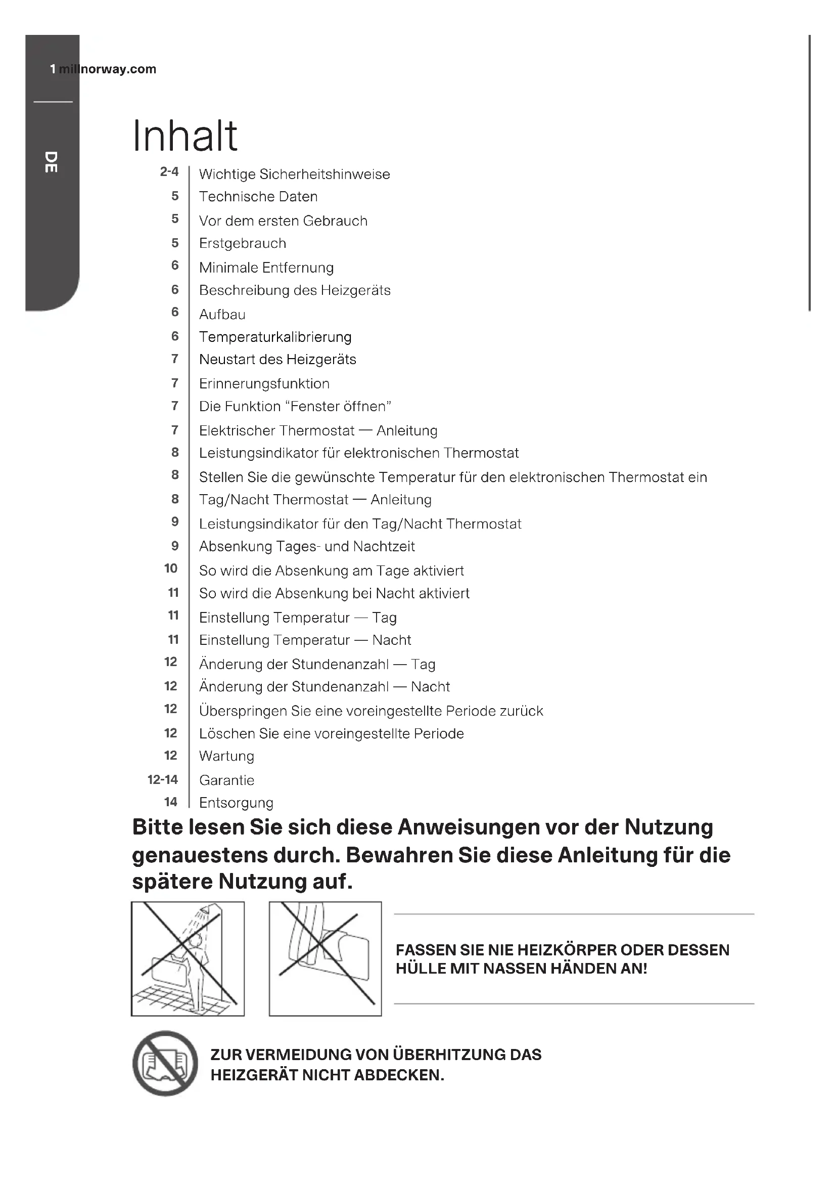 Wichtige Sicherheitshinweise Technische Daten Vor dem ersten Gebrauch Erstgebrauch Minimale Entfernung Beschreibung des Heizgeräts Aufbau Temperaturkalibrierung Neustart des Heizgeräts Erinnerungsfunktion Die Funktion “Fenster öffnen” Elektrischer Thermostat Anleitung Leistungsindikator für elektronischen Thermostat Stellen Sie die gewünschte Temperatur für den elektronischen Thermostat ein Tag/Nacht Thermostat Anleitung Leistungsindikator für den Tag/Nacht Thermostat Absenkung Tages- und Nachtzeit So wird die Absenkung am Tage aktiviert So wird die Absenkung bei Nacht aktiviert Einstellung Temperatur — Tag Einstellung Temperatur — Nacht Änderung der Stundenanzahl — Tag Änderung der Stundenanzahl — Nacht Überspringen Sie eine voreingestellte Periode zurück Löschen Sie eine voreingestellte Periode Wartung Garantie Entsorgung Bitte lesen Sie sich diese Anweisungen vor der Nutzung genauestens durch. Bewahren Sie diese Anleitung für die spätere Nutzung auf. FASSEN SIE NIE HEIZKÖRPER ODER DESSEN HÜLLE MIT NASSEN HÄNDEN AN!