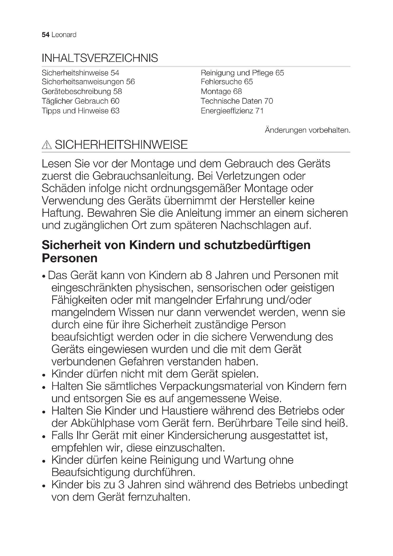 - Vous pouvez utiliser la chaleur résiduelle pour conserver les aliments au chaud ou pour faire fondre. EN MATIÈRE DE PROTECTION DE L'ENVIRONNEMENT Recyclez les matériaux portant le symbole . Déposez les emballages dans les conteneurs prévus à cet effet. Contribuez à la protection de l'environnement et à votre sécurité, recyclez vos produits électriques et électroniques. Ne jetez pas les appareils portant le symbole avec les ordures ménagères. Emmenez un tel produit dans votre centre local de recyclage ou contactez vos services municipaux. Leonard 53INHALTSVERZEICHNIS Sicherheitshinweise 54 Sicherheitsanweisungen 56 Gerätebeschreibung 58 Täglicher Gebrauch 60 Tipps und Hinweise 63 Reinigung und Pflege 65 Fehlersuche 65 Montage 68 Technische Daten 70 Energieeffizienz 71 Änderungen vorbehalten. SICHERHEITSHINWEISE Lesen Sie vor der Montage und dem Gebrauch des Geräts zuerst die Gebrauchsanleitung. Bei Verletzungen oder Schäden infolge nicht ordnungsgemäßer Montage oder Verwendung des Geräts übernimmt der Hersteller keine Haftung. Bewahren Sie die Anleitung immer an einem sicheren und zugänglichen Ort zum späteren Nachschlagen auf. Sicherheit von Kindern und schutzbedürftigen Personen