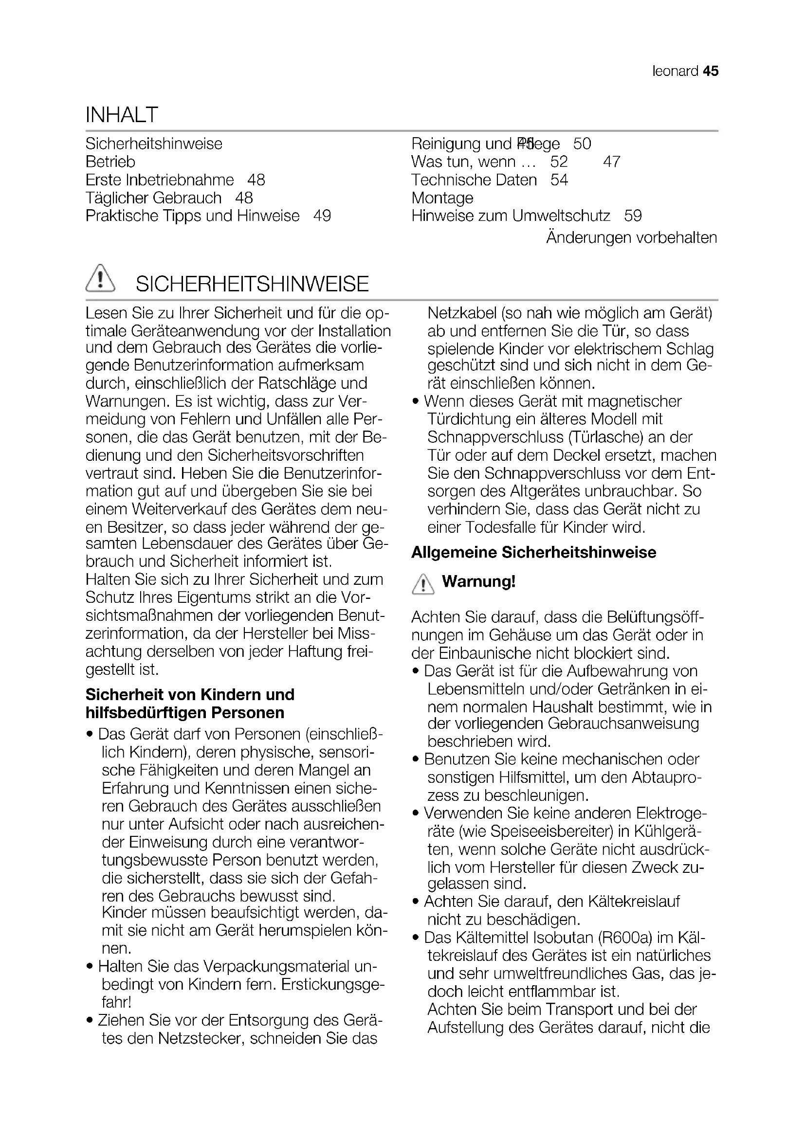 - La porte ouvre et ferme correctement. EN MATIÈRE DE SAUVEGARDE DE L'ENVIRONNEMENT Le symbole sur le produit ou son emballage indique que ce produit ne peut être traité comme déchet ménager. Il doit être remis au point de collecte dédié à cet effet (collecte et recyclage du matériel électrique et électronique). En procédant à la mise au rebut de l'appareil dans les règles de l’art, nous préservons l'environnement et notre sécurité, s’assurant ainsi que les déchets seront traités dans des conditions optimum. Pour obtenir plus de détails sur le recyclage de ce produit, veuillez prendre contact avec les services de votre commune ou le magasin où vous avez effectué l'achat. 44 leonardINHALT Sicherheitshinweise 45 Betrieb 47 Erste Inbetriebnahme 48 Täglicher Gebrauch 48 Praktische Tipps und Hinweise 49 Reinigung und Pflege 50 Was tun, wenn … 52 Technische Daten 54 Montage 54 Hinweise zum Umweltschutz 59 Änderungen vorbehalten SICHERHEITSHINWEISE Lesen Sie zu Ihrer Sicherheit und für die op- timale Geräteanwendung vor der Installation und dem Gebrauch des Gerätes die vorlie- gende Benutzerinformation aufmerksam durch, einschließlich der Ratschläge und Warnungen. Es ist wichtig, dass zur Ver- meidung von Fehlern und Unfällen alle Per- sonen, die das Gerät benutzen, mit der Be- dienung und den Sicherheitsvorschriften vertraut sind. Heben Sie die Benutzerinfor- mation gut auf und übergeben Sie sie bei einem Weiterverkauf des Gerätes dem neu- en Besitzer, so dass jeder während der ge- samten Lebensdauer des Gerätes über Ge- brauch und Sicherheit informiert ist. Halten Sie sich zu Ihrer Sicherheit und zum Schutz Ihres Eigentums strikt an die Vor- sichtsmaßnahmen der vorliegenden Benut- zerinformation, da der Hersteller bei Miss- achtung derselben von jeder Haftung frei- gestellt ist. Sicherheit von Kindern und hilfsbedürftigen Personen