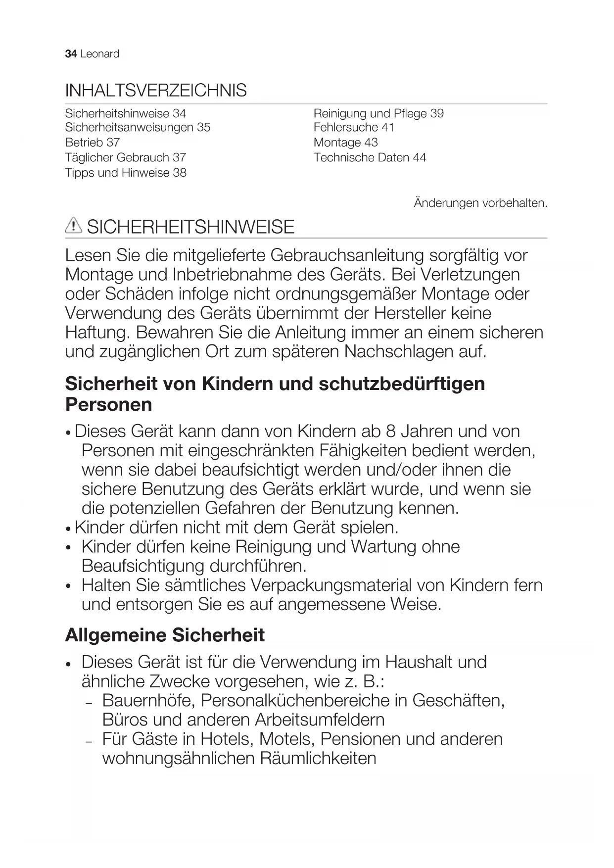 - Wenn Sie das Gerät verschieben möchten, heben Sie es bitte an der Leonard 35Vorderkante an, um den Fußboden nicht zu verkratzen. Elektrischer Anschluss WARNUNG! Brand- und Stromschlaggefahr.