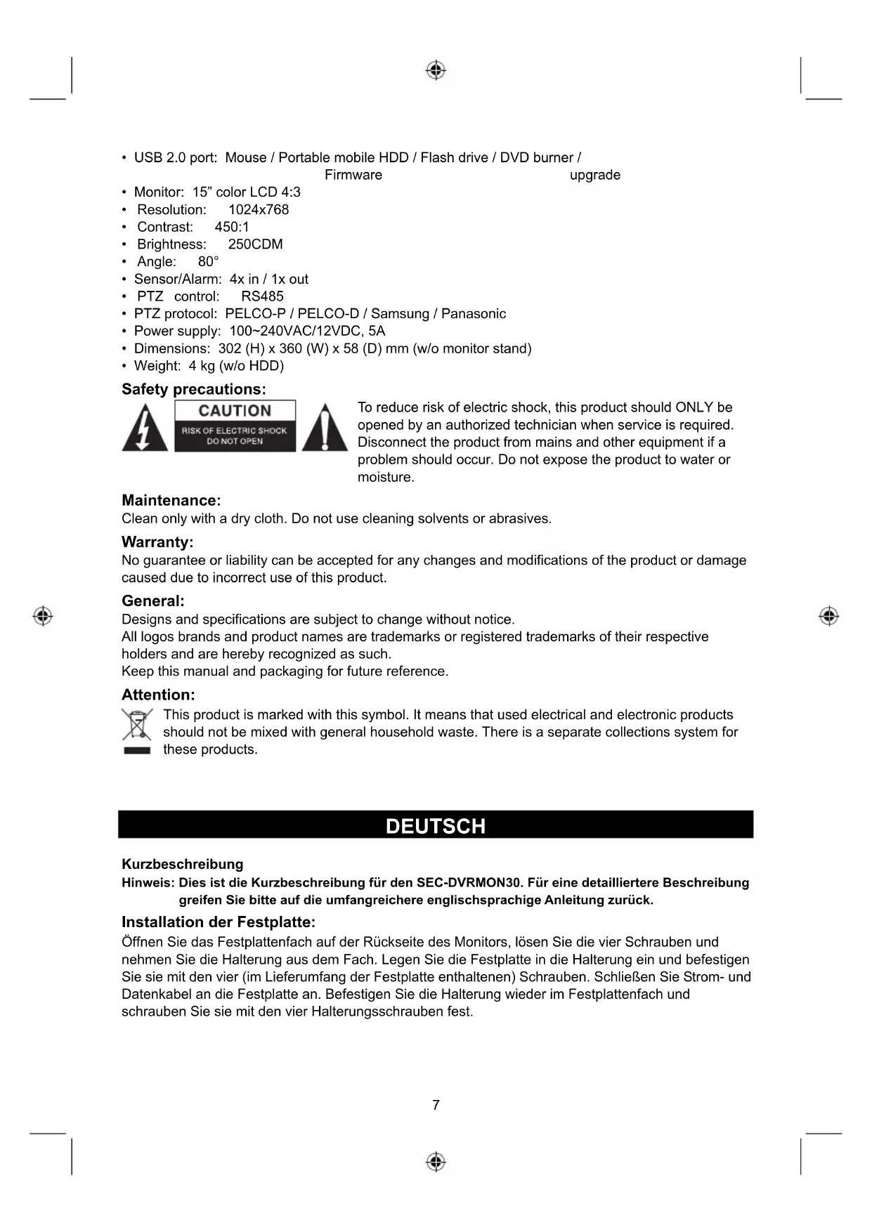 - Gewicht: 4 kg (ohne Festplatte) Sicherheitsvorkehrungen: Um das Risiko eines elektrischen Schlags zu verringern, sollte dieses Produkt AUSSCHLIESSLICH von einem autorisierten Techniker geöffnet werden. Bei Problemen trennen Sie das Gerät bitte von der Spannungsversorgung und von anderen Geräten ab. Stellen Sie sicher, dass das Gerät nicht mit Wasser oder Feuchtigkeit in Berührung kommt. Wartung: Nur mit einem trockenen Tuch säubern. Keine Reinigungs- oder Scheuermittel verwenden. Garantie: Es kann keine Garantie oder Haftung für irgendwelche Änderungen oder Modifikationen des Produkts oder für Schäden übernommen werden, die aufgrund einer nicht ordnungsgemäßen Anwendung des Produkts entstanden sind. Allgemeines: Design und technische Daten können ohne vorherige Ankündigung geändert werden. Alle Logos, Marken und Produktnamen sind Marken oder eingetragene Marken ihrer jeweiligen Eigentümer und werden hiermit als solche anerkannt. Bitte bewahren Sie Bedienungsanleitung und Verpackung für spätere Verwendung auf. Achtung: Dieses Produkt ist mit diesem Symbol gekennzeichnet. Es bedeutet, dass die ausgedienten elektrischen und elektronischen Produkte nicht mit dem allgemeinen Haushaltsmüll entsorgt werden dürfen. Für diese Produkte stehen gesonderte Sammelsysteme zur Verfügung.14 FRANÇAIS Moniteur 15” avec DVR Guide descriptif rapide Note : Ceci est un descriptif rapide du SEC-DVRMON30. Pour les détails complets sur la façon de d’utiliser le SEC-DVRMON30, référez-vous au manuel avancé en Anglais. Installation de l’unité du Disque Dur: Ouvrez le compartiment du disque dur avec les 4 vis au fond du moniteur et sortez le support. Installez l’unité du disque dur dans le support et fixez-la au support avec les 4 vis (fournies avec le disque dur). Branchez le connecteur de puissance et le connecteur de données sur le disque dur. Replacez le support dans le compartiment et fixez-le avec les 4 vis.