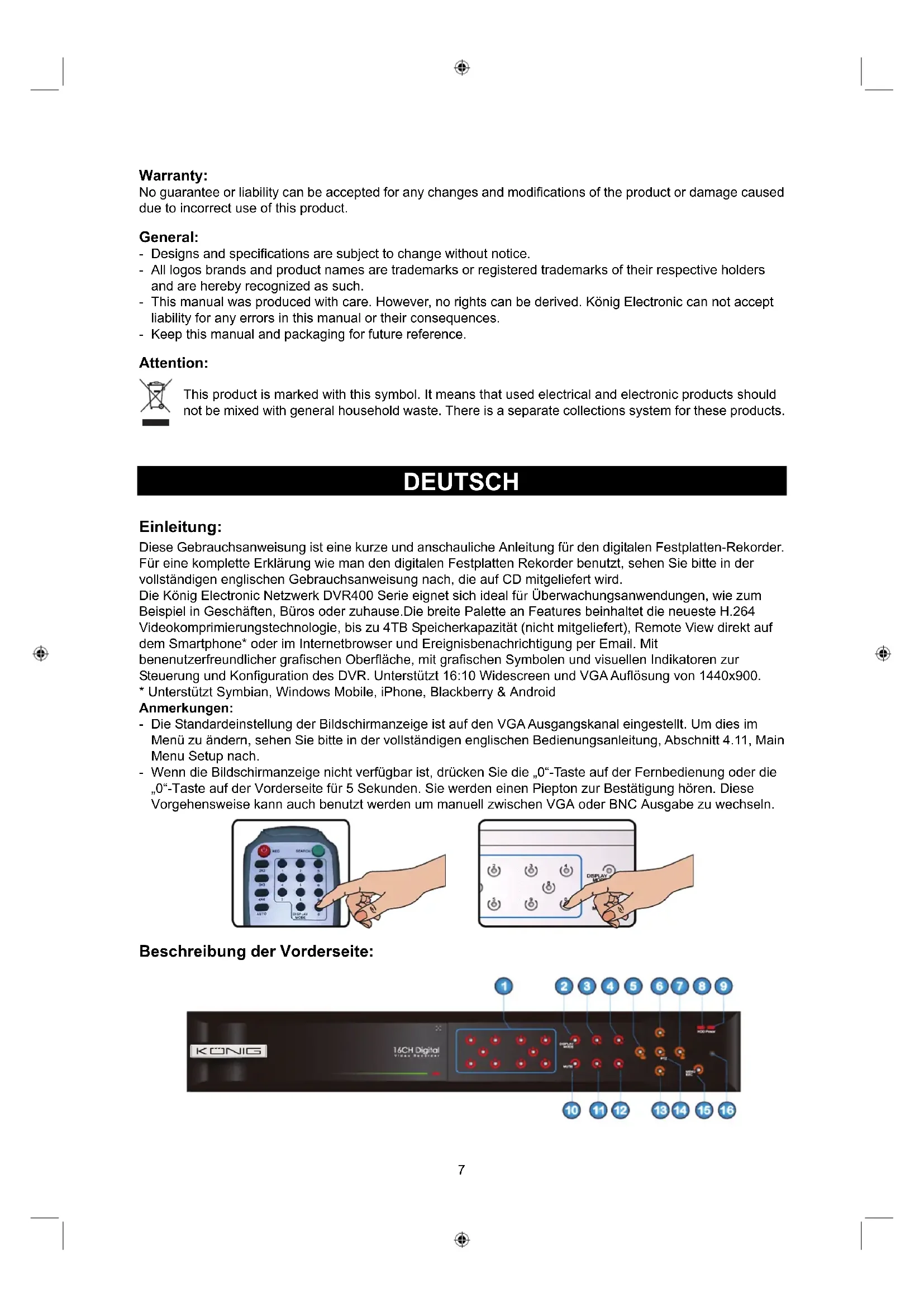 die entsprechenden Schrauben wieder fest. Bedienung des Festplatten Rekorders: Wenn die Festplatte installiert ist und alle Kabel angeschlossen sind ist der Festplatten Rekorder fertig zum Gebrauch. Um die erweiterten Einstellungen am Festplatten Rekorder vorzunehmen müssen Sie die Anleitung zu Rate ziehen. Für Anweisungen, wie man den Festplatten Rekorder mit dem Menü einstellt beziehen Sie sich bitte auf die vollständige englische Anleitung, die auf CD mitgeliefert wird. Sicherheitsvorkehrungen: Wenn eine Reparatur notwendig ist, sollte dieses Produkt NUR von einem autorisierten Techniker geöffnet werden. Bei Problemen trennen Sie das Gerät bitte von der Spannungsversorgung und von anderen Geräten ab. Stellen Sie sicher, dass das Gerät nicht mit Wasser oder Feuchtigkeit in Berührung kommt. Wartung: Nur mit einem trockenen Tuch säubern. Keine Reinigungs- oder Scheuermittel verwenden. Garantie: Es kann keine Garantie oder Haftung für irgendwelche Änderungen oder Modifikationen des Produkts oder für Schäden übernommen werden, die aufgrund einer nicht ordnungsgemäßen Anwendung des Produkts entstanden sind. Allgemeines: - Design und technische Daten können ohne vorherige Ankündigung geändert werden. - Alle Logos, Marken und Produktnamen sind Marken oder eingetragene Marken ihrer jeweiligen Eigentümer und werden hiermit als solche anerkannt. - Diese Bedienungsanleitung wurde sorgfältig verfasst. Dennoch können daraus keine Rechte und Pflichten hergeleitet werden. König Electronic haftet nicht für mögliche Fehler in dieser Bedienungsanleitung oder deren Folgen. - Bitte bewahren Sie Bedienungsanleitung und Verpackung für spätere Verwendung auf. Achtung: Dieses Produkt ist mit diesem Symbol gekennzeichnet. Es bedeutet, dass die ausgedienten elektrischen und elektronischen Produkte nicht mit dem allgemeinen Haushaltsmüll entsorgt werden dürfen. Für diese Produkte stehen gesonderte Sammelsysteme zur Verfügung.