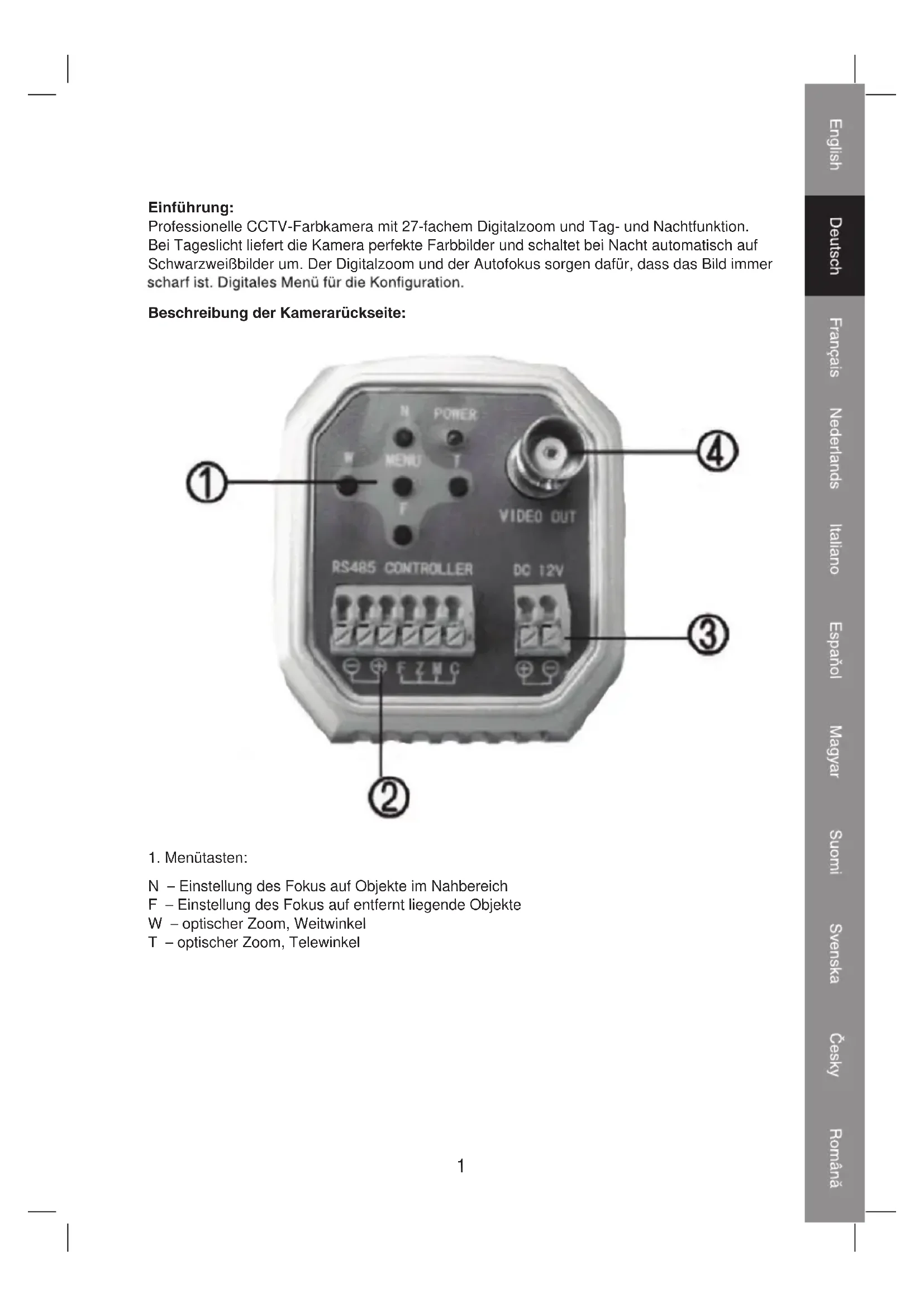 CCTV 27x ZOOMKAMERA1 Einführung: Professionelle CCTV-Farbkamera mit 27-fachem Digitalzoom und Tag- und Nachtfunktion. Bei Tageslicht liefert die Kamera perfekte Farbbilder und schaltet bei Nacht automatisch auf Schwarzweißbilder um. Der Digitalzoom und der Autofokus sorgen dafür, dass das Bild immer Beschreibung der Kamerarückseite: