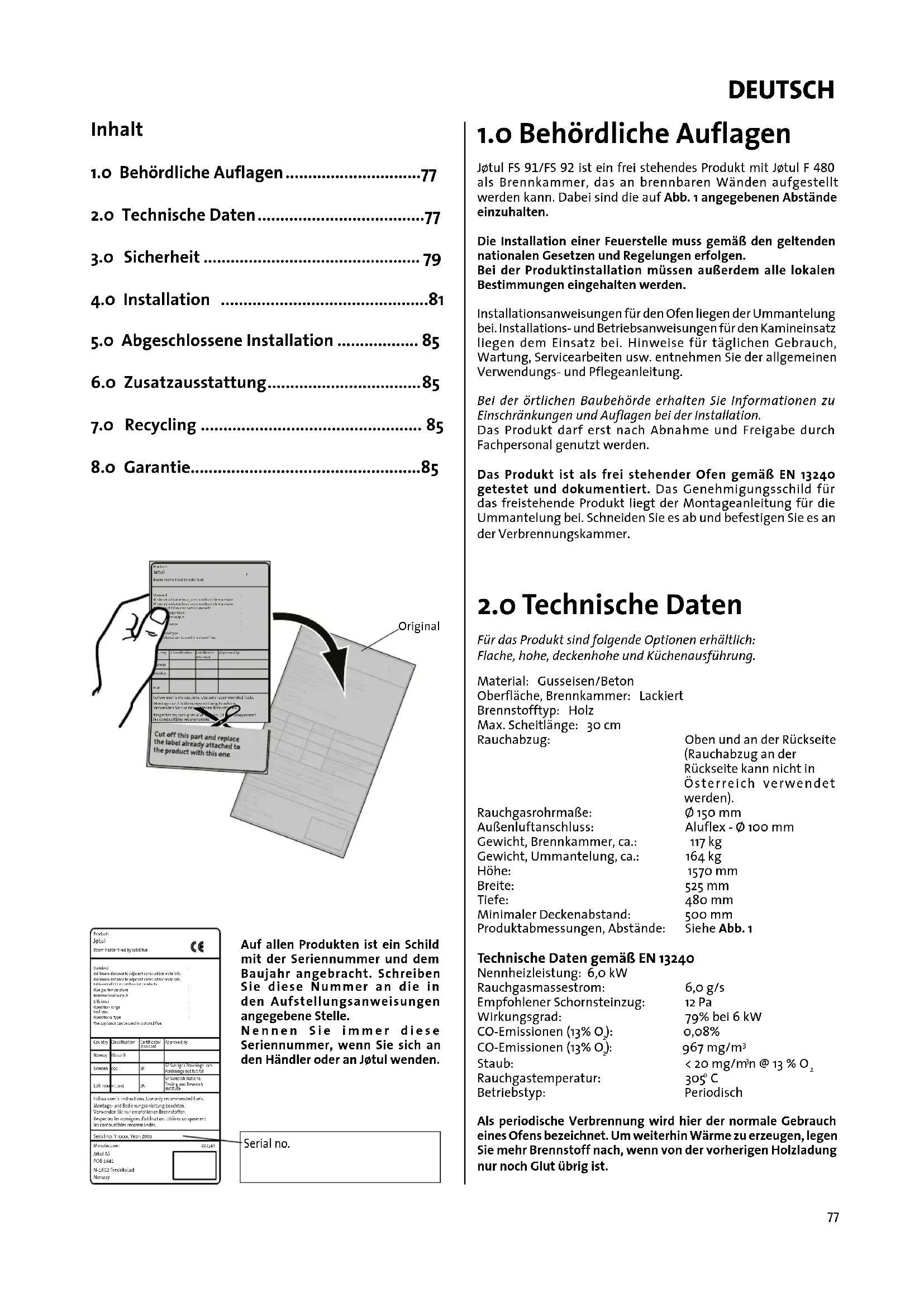 Jøtul AS gewährt Kunden eine zehnjährige Garantie. Diese schließt das Recht ein, äußere Komponenten aus Gusseisen zurückzugeben, wenn diese Defekte aufgrund von Material- und bzw. oder Herstellungsfehlern aufweisen. Der Garantiezeitraum beginnt mit dem Kauf bzw. der Installation des Kamins. Der Käufer besitzt ein Rückgaberecht, wenn der Kamin gemäß den geltenden Gesetzen und Regelungen sowie der Montage- und Bedienungsanleitung von Jøtul ausgeführt wurde. Folgendes wird von der Garantie nicht eingeschlossen: Die Installation von Zusatzausstattung, z.B. zur Anpassung lokaler Zugverhältnisse, Luftzufuhr oder anderer Umstände, die sich Jøtuls Einflussnahme entziehen. Die Garantie gilt nicht für Teile wie Brennerplatten, Rauchleitbleche, Feuerroste, Bodenroste, feuerfeste Ziegel, Dämpfer und Dichtungen, da diese im Laufe der Zeit einem normalen Verbrauch oder Verschleiß unterliegen. Die Garantie deckt keine Schäden ab, die durch Verwendung eines ungeeigneten Brennstoffs zum Entzünden von Feuer verursacht werden, z.B. Treibholz, imprägniertes oder angestrichenes Holz, Bretterverschnitt, Spanplatten usw. Zu einer Überhitzung kann es ohne Weiteres kommen, wenn ein ungeeigneter Brennstoff verwendet wird. Dabei wird der Kamin rotglühend, wodurch eine Entfärbung stattfindet und in den Gusseisenteilen Risse entstehen.Die Garantie deckt keine Schäden ab, die beim Transport zwischen Händler und Lieferadresse entstehen. Die Garantie erstreckt sich nicht auf Schäden, die durch die Verwendung von Teilen von Drittanbietern entstehen.86 Al onze producten zijn voorzien van een label met een serienummer en een jaartal. Noteer dit nummer op de daarvoor bestemde plaats, zoals aangegeven in de installatie- instructies. Houd dit serienummer bij de hand als u contact opneemt met uw leverancier of met Jøtul. les combustibles recommandés.Respectez les consignes d'utilisation. Utilisez uniquementVerwenden Sie nur empfohlenen Brennstoffen.Montage- und Bedienungsanleitung beachten. Follow user`s instructions. Use only recommended fuels.standardCertificate/The appliance can be used in a shared flue.Minimum distance to adjacent combustible materials:Emission of CO in combustion productsSerial no: Y-xxxx, Year: 200xManufacturer:N-1602 FredrikstadNorwayJøtul ASPOB 1441SwedenEUR IntermittentNominal heat output NorwayCountryOperational typeFuel typeOperation rangeEfficiencyKlasse IIClassificationStandardFlue gas temperature Room heater fired by solid fuelProduct:JøtulSP Sveriges Provnings- och221546Forskningsinstitut ABSP Swedish National Testing and ResearchInstitute Approved by