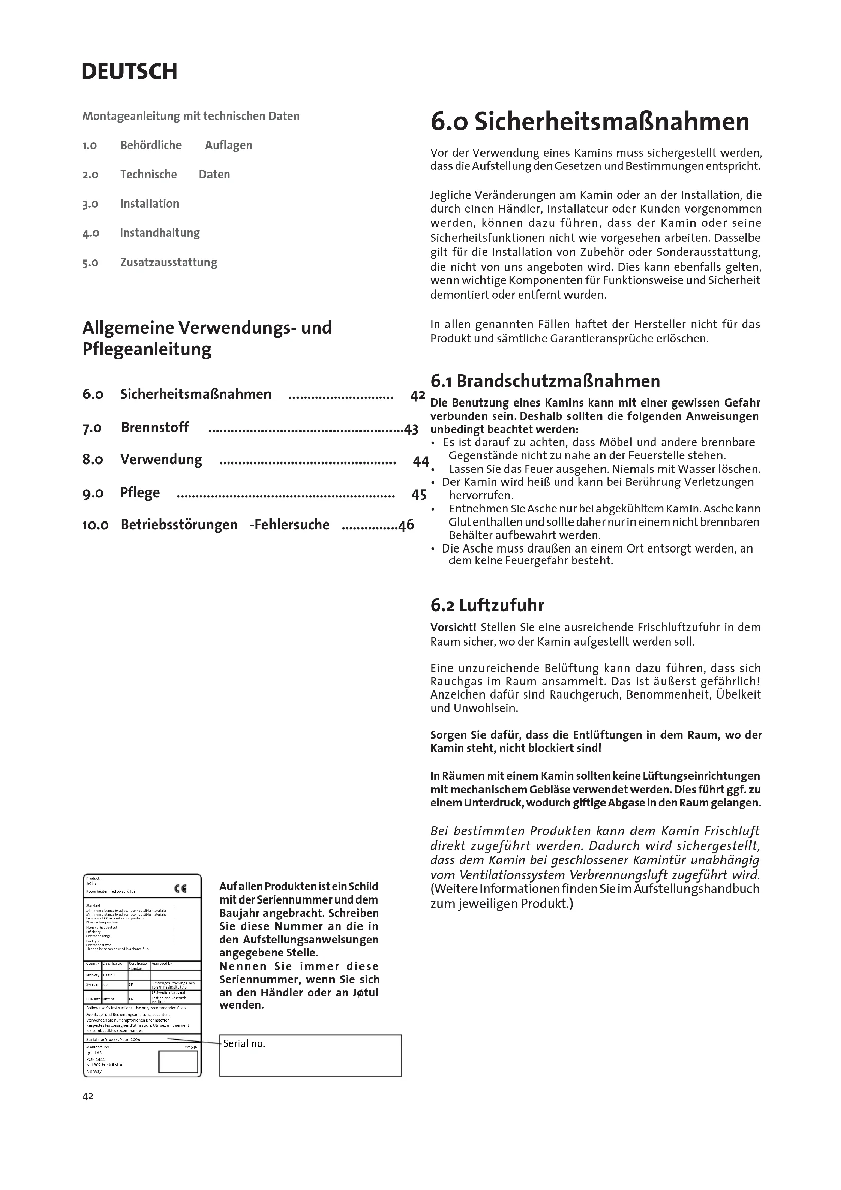 Serial no. Auf allen Produkten ist ein Schild mit der Seriennummer und dem Baujahr angebracht. Schreiben Sie diese Nummer an die in den Aufstellungsanweisungen angegebene Stelle. Nennen Sie immer diese Seriennummer, wenn Sie sich an den Händler oder an Jøtul wenden. DEUTSCH