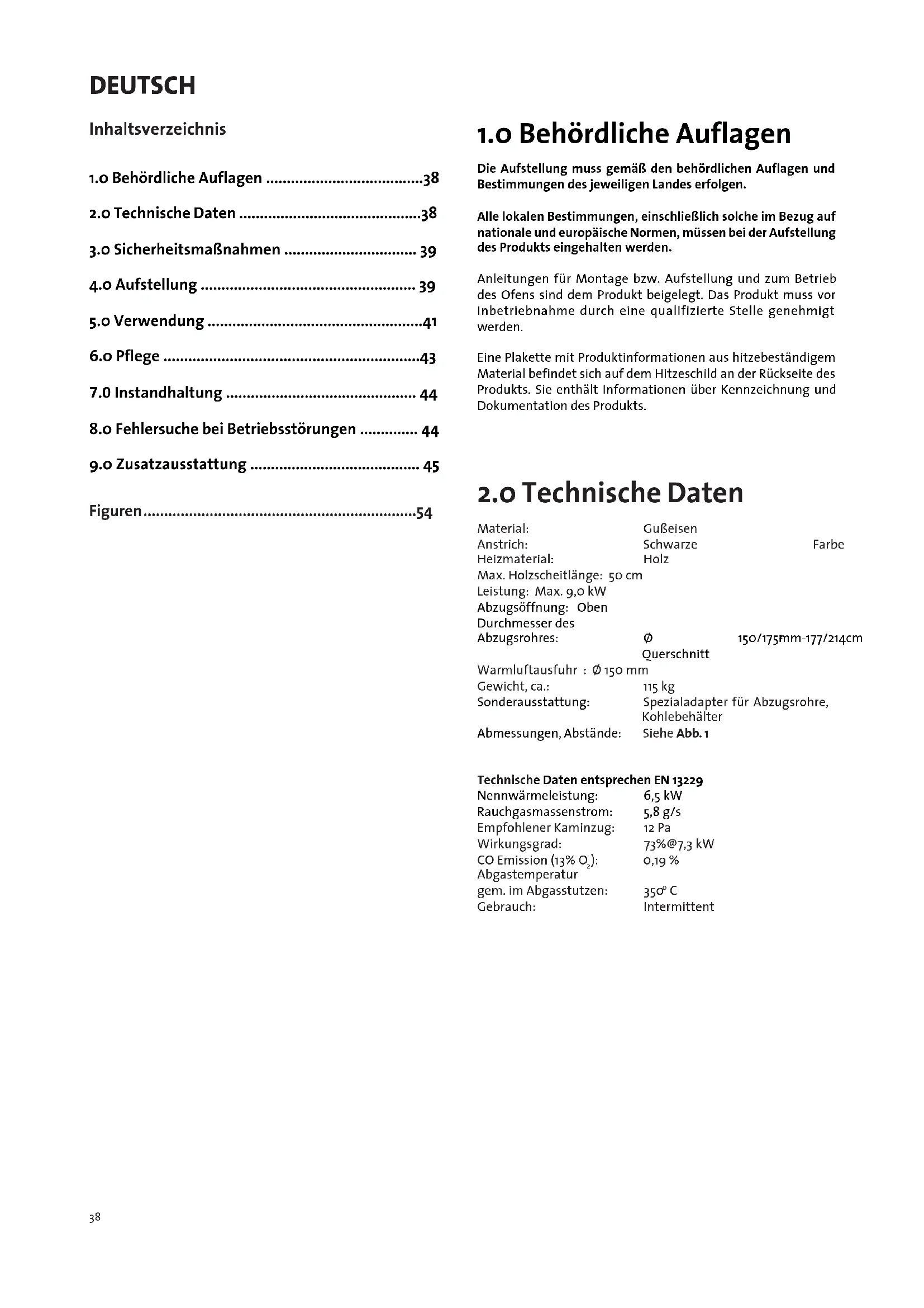 Querschnitt Warmluftausfuhr : Ø 150 mm Gewicht, ca.: 115 kg Sonderausstattung: Spezialadapter für Abzugsrohre, Kohlebehälter Abmessungen, Abstände: Siehe Abb. 1 Technische Daten entsprechen EN 13229 Nennwärmeleistung: 6,5 kW Rauchgasmassenstrom: 5,8 g/s Empfohlener Kaminzug: 12 Pa Wirkungsgrad: 73%@7,3 kW CO Emission (13% O