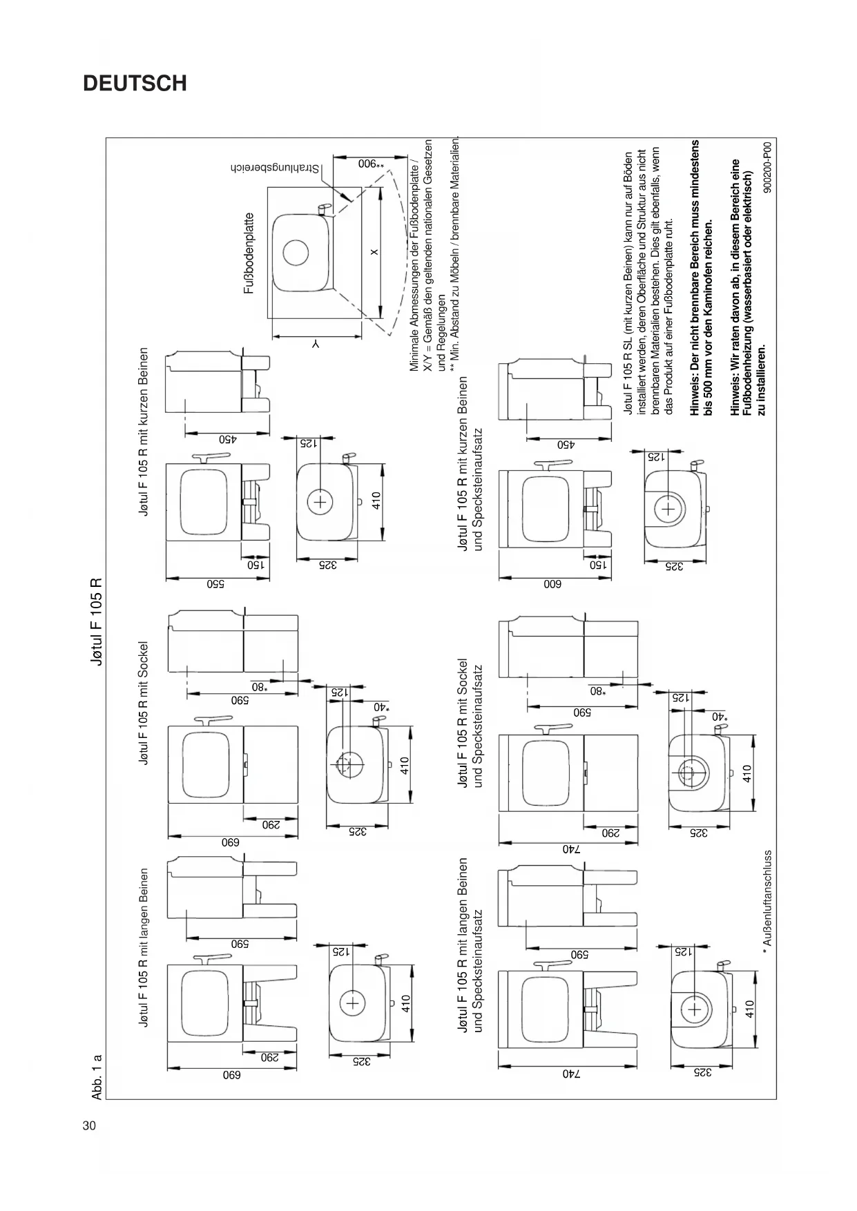 Abstand zu Wänden aus brennbaren Materialien gehen aus Abb. 1b hervor. Der Kamin kann mit einem nicht isolierten Rauchgasrohr eingesetzt werden, wenn die Abstände zwischen Kamin und Wänden aus brennbaren Materialien den Vorgaben auf Abb. 1b entsprechen. Hinweis: Stellen Sie das Produkt so auf, dass Kaminofen, Rauchgasrohr und Schornsteindurchlass gereinigt werden können. Hinweis: Vergewissern Sie sich, dass Möbel u.a. Haushaltsgegenstände nicht zu nahe am Kaminofen stehen, damit sie nicht austrocknen. Stellen Sie sicher, dass sich Möbel und andere brennbare Materialien nicht zu dicht am Kamin befi nden. Brennbare Materialien müssen mindestens 1100 mm vom Kamin entfernt sein. DEUTSCH29 DEUTSCH Jøtul F 105 B Abb 1 Jøtul F 105 R B (Sockel)(Sockel) Jøtul F 105 LL Jøtul F 105 R LL (Lange Beine)(Lange Beine) Jøtul F 105 SL Jøtul F 105 R SL (Kurze Beine)(Kurze Beine)