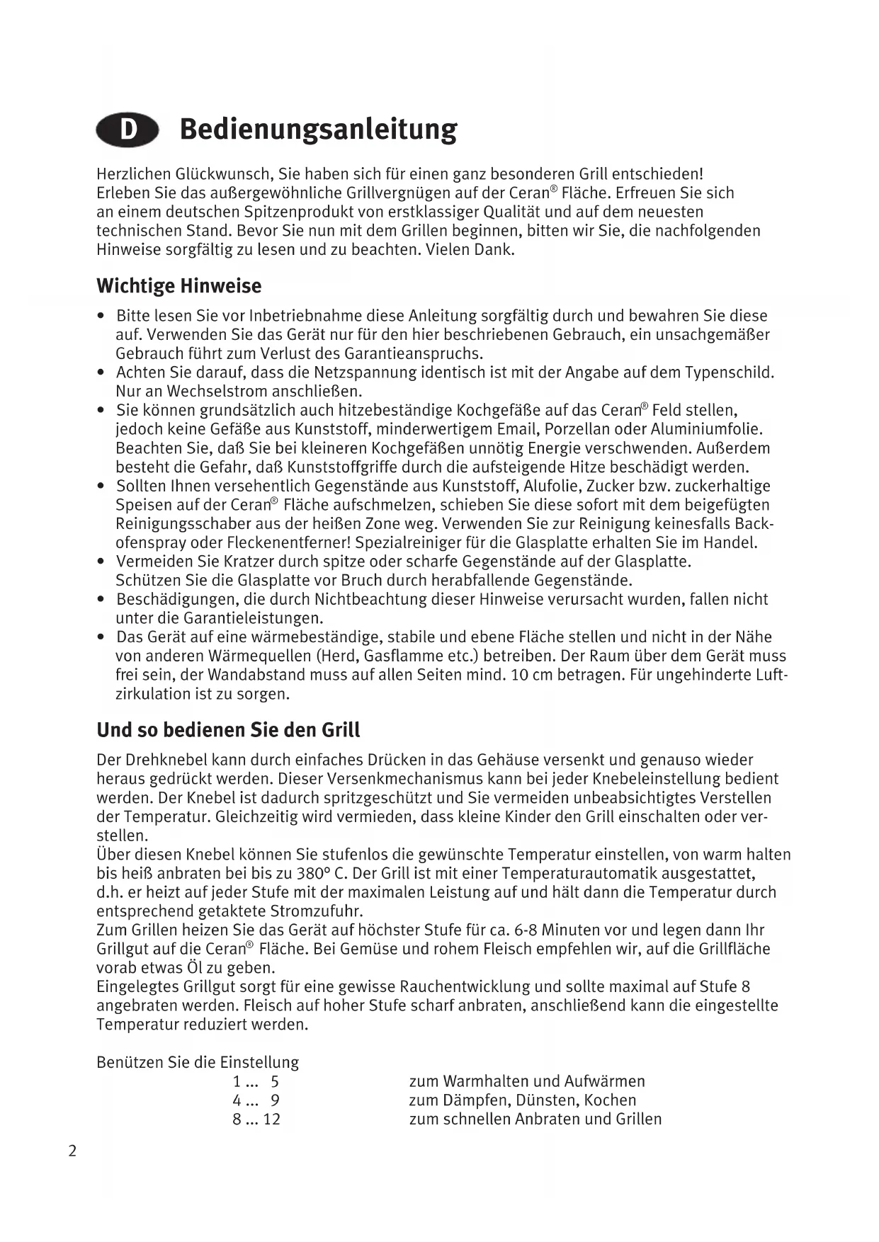 Fläche. Erfreuen Sie sich an einem deutschen Spitzenprodukt von erstklassiger Qualität und auf dem neuesten technischen Stand. Bevor Sie nun mit dem Grillen beginnen, bitten wir Sie, die nachfolgenden Hinweise sorgfältig zu lesen und zu beachten. Vielen Dank. Wichtige Hinweise