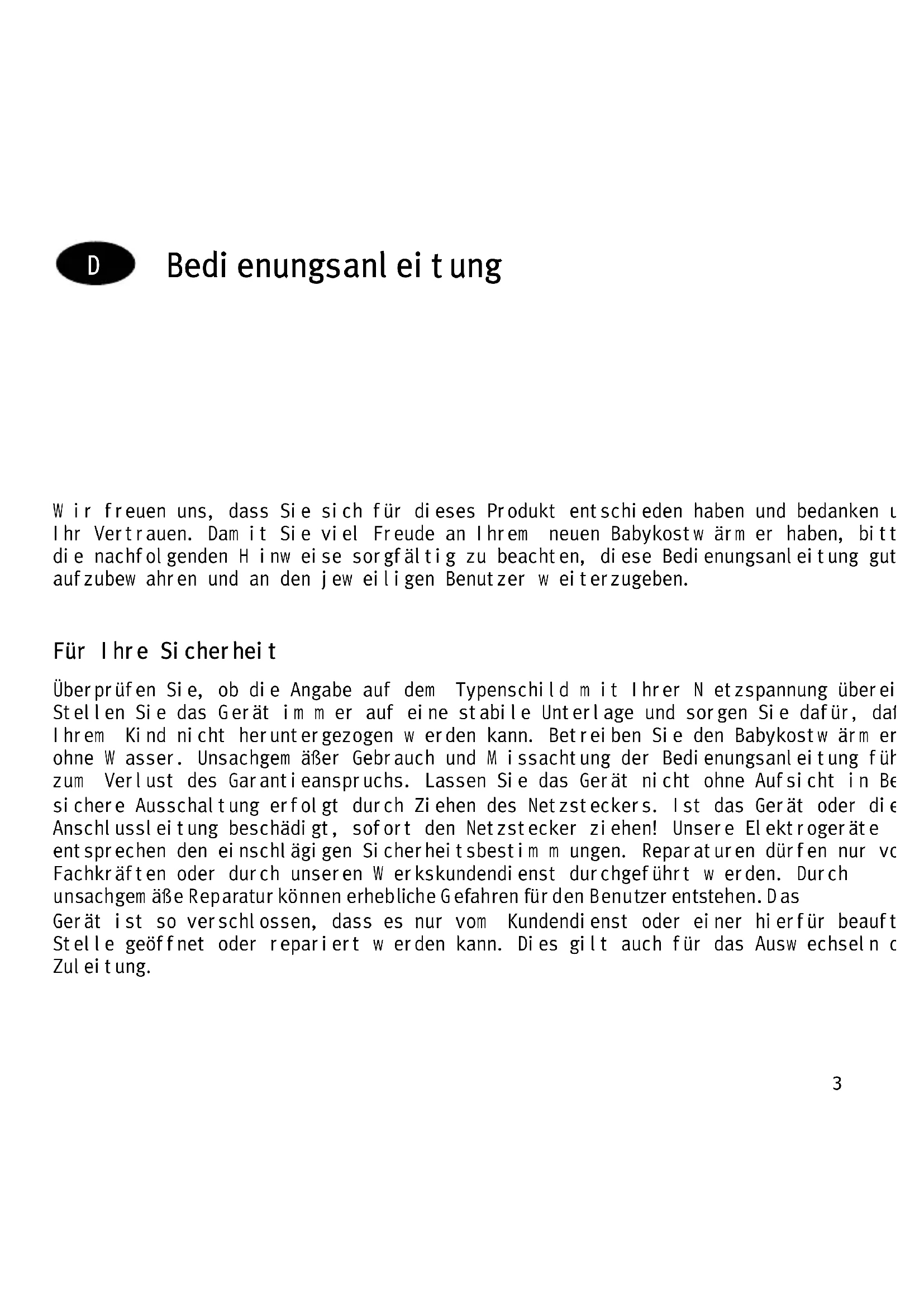 W ir freuen uns, dass Sie sich für dieses Produkt entschieden haben und bedanken uns für Ihr Vertrauen. Dam it Sie viel Freude an Ihrem neuen Babykostw ärm er haben, bitten w ir Sie, die nachfolgenden H inw eise sorgfältig zu beachten, diese Bedienungsanleitung gut aufzubew ahren und an den jew eiligen Benutzer w eiterzugeben.
