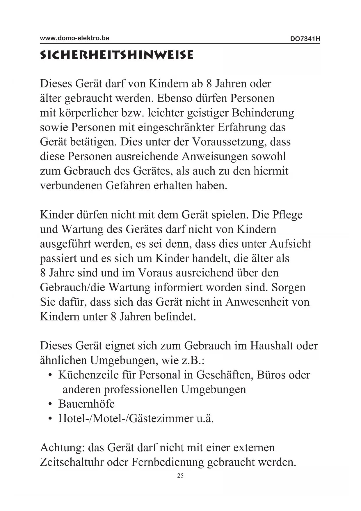 - Hotel-/Motel-/Gästezimmer u.ä. Achtung: das Gerät darf nicht mit einer externen Zeitschaltuhr oder Fernbedienung gebraucht werden.DO7341H