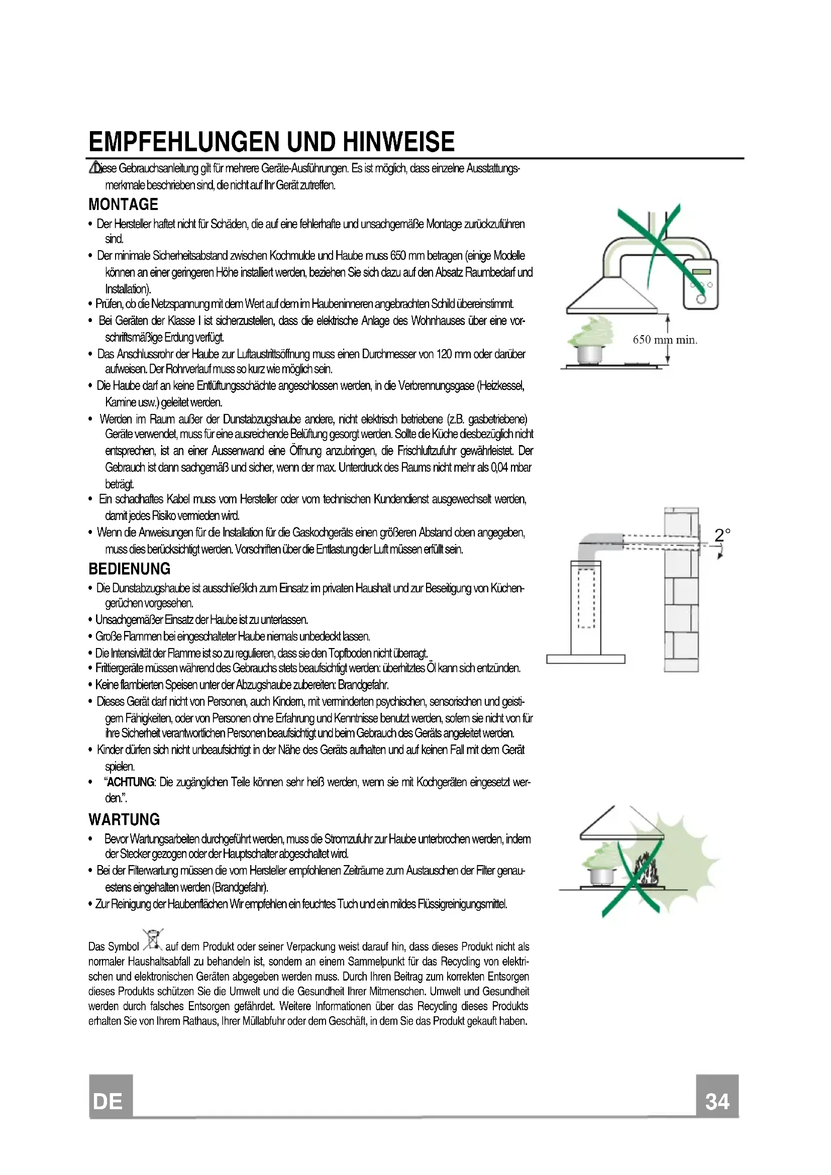 - Bevor Wartungsarbeiten durchgeführt werden, muss die Stromzufuhr zur Haube unterbrochen werden, indem der Stecker gezogen oder der Hauptschalter abgeschaltet wird. • Bei der Filterwartung müssen die vom Hersteller empfohlenen Zeiträume zum Austauschen der Filter genau-estens eingehalten werden (Brandgefahr). • Zur Reinigung der Haubenflächen Wir empfehlen ein feuchtes Tuch und ein mildes Flüssigreinigungsmittel. Das Symbol auf dem Produkt oder seiner Verpackung weist darauf hin, dass dieses Produkt nicht als normaler Haushaltsabfall zu behandeln ist, sondern an einem Sammelpunkt für das Recycling von elektri-schen und elektronischen Geräten abgegeben werden muss. Durch Ihren Beitrag zum korrekten Entsorgen dieses Produkts schützen Sie die Umwelt und die Gesundheit Ihrer Mitmenschen. Umwelt und Gesundheit werden durch falsches Entsorgen gefährdet. Weitere Informationen über das Recycling dieses Produkts erhalten Sie von Ihrem Rathaus, Ihrer Müllabfuhr oder dem Geschäft, in dem Sie das Produkt gekauft haben.