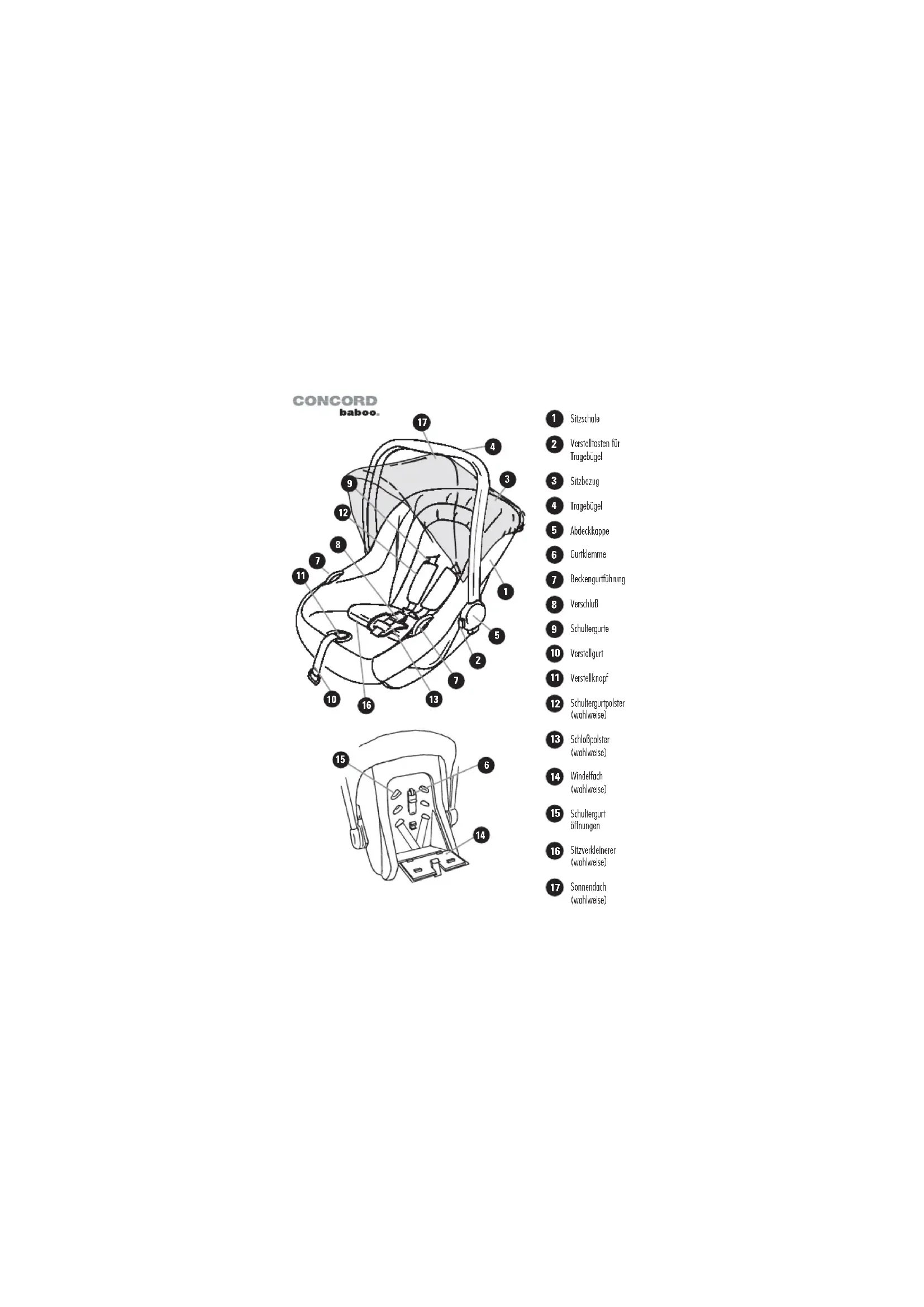 15Deutsch CONCORD BABOO Befestigen des Baboo im Fahrzeug Seite 1 Sichern des Babys im Baboo Seite 2 Verstellen der Schultergurte Seite 3 Verstellen des Tragebügels Seite 3 ALLGEMEIN Pflegeanleitung Seite 4 Wichtige Hinweise Seite 4 Zur Beachtung Seite 6 Zubehör Seite 6 Garantie Seite 7Herzlichen Glückwunsch zu Ihrem Baby. Wir wünschen Ihnen viele schöne gemeinsame Stunden mit Ihrem Baby. Zum Transport, Schutz und zur Sicherung Ihres Kindes haben Sie sich für unseren Sitz CONCORD Baboo entschieden. Das Produkt wird unter Einhaltung einer sorgfältigen Qualitätskontrolle hergestellt. Seine optimalen Sicherheitseigenschaften kann es erst dann zur Wirkung bringen, wenn es vorschriftsmäßig verwendet wird. Achten Sie deshalb auf die korrekte Einhaltung der Einbau- und Bedienungsanleitung. Der Sitz kann auf allen Plätzen des Fahrzeuges ohne Airbag verwendet werden, die mit einem Dreipunktgurt ausgestattet sind. Aus unfallstatistischen Gründen empfehlen wir den Platz hinter dem Beifahrersitz. Der Baboo ist gemäß ECE Regelung 44 zugelassen und eignet sich für Babys bis ca. 18 Monate (bis 13 kg Körpergewicht). Befestigen des Baboo im Fahrzeug Den Tragebügel (4) in Stellung A bringen (Abb. 1). Den Baboo immer gegen die Fahrtrichtung auf den Fahrzeugsitz stellen (Abb. 2). Für den Einbau sind zwei Alternativen möglich, wobei Alternative 2 für Fahrzeuge mit kürzeren Fahrzeuggurten zu empfehlen ist. Alternative A: Den Beckengurt des Fahrzeuggurtes durch die seitlichen blau markierten Gurtführungen (7) ziehen und die Schlosszunge im Gurtschloss einklicken (Abb. 2a + b). Die Schultergurtklemme (6) an der Rückseite des Baboo öffnen (Abb. 4). Den Beckengurt spannen und den Schultergurt um die Rückseite des Baboo legen (Abb. 2). Den Schultergurt spannen und in die blau markierte Gurtklemme (6) legen (Abb. 4). Die Vorderkante des Baboo und das Ende des Tragebügels sollen an der Fahrzeugrückenlehne anliegen (Abb. 2). Die Gurtklemme schließen (Abb. 4).