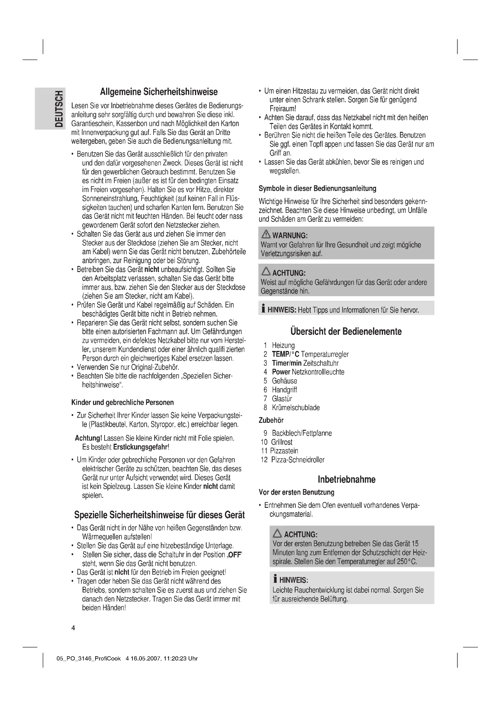 - Entnehmen Sie dem Ofen eventuell vorhandenes Verpa- ckungsmaterial. ACHTUNG: Vor der ersten Benutzung betreiben Sie das Gerät 15 Minuten lang zum Entfernen der Schutzschicht der Heiz- spirale. Stellen Sie den Temperaturregler auf 250°C. HINWEIS: Leichte Rauchentwicklung ist dabei normal. Sorgen Sie für ausreichende Belüftung. 05_PO_3146_ProfiCook 4 16.05.2007, 11:20:23 Uhr5 DEUTSCH DEUTSCH Bedienung