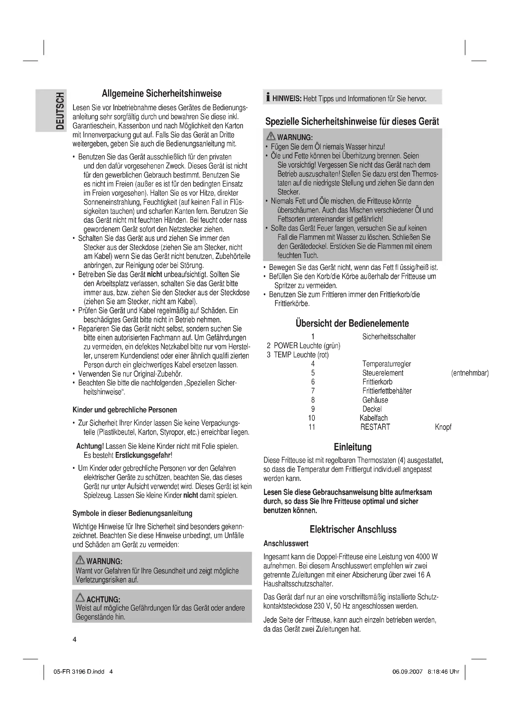 - Benutzen Sie zum Frittieren immer den Frittierkorb/die Frittierkörbe. Übersicht der Bedienelemente 1 Sicherheitsschalter 2 POWER Leuchte (grün) 3 TEMP Leuchte (rot) 4 Temperaturregler 5 Steuerelement (entnehmbar) 6 Frittierkorb 7 Frittierfettbehälter 8 Gehäuse 9 Deckel 10 Kabelfach 11 RESTART Knopf Einleitung Diese Fritteuse ist mit regelbaren Thermostaten (4) ausgestattet, so dass die Temperatur dem Frittiergut individuell angepasst werden kann. Lesen Sie diese Gebrauchsanweisung bitte aufmerksam durch, so dass Sie Ihre Fritteuse optimal und sicher benutzen können. Elektrischer Anschluss Anschlusswert Ingesamt kann die Doppel-Fritteuse eine Leistung von 4000 W aufnehmen. Bei diesem Anschlusswert empfehlen wir zwei getrennte Zuleitungen mit einer Absicherung über zwei 16 A Haushaltsschutzschalter. Das Gerät darf nur an eine vorschriftsmäßig installierte Schutz- kontaktsteckdose 230 V, 50 Hz angeschlossen werden. Jede Seite der Fritteuse, kann auch einzeln betrieben werden, da das Gerät zwei Zuleitungen hat. 05-FR 3196 D.indd 405-FR 3196 D.indd 4 06.09.2007 8:18:46 Uhr06.09.2007 8:18:46 Uhr5 DEUTSCH DEUTSCH ACHTUNG: ÜBERLASTUNG Benutzen Sie keine Verlängerungsleitungen oder Mehr- fachsteckdosen, da dieses Gerät zu leistungsstark ist. Inbetriebnahme Vor der ersten Inbetriebnahme