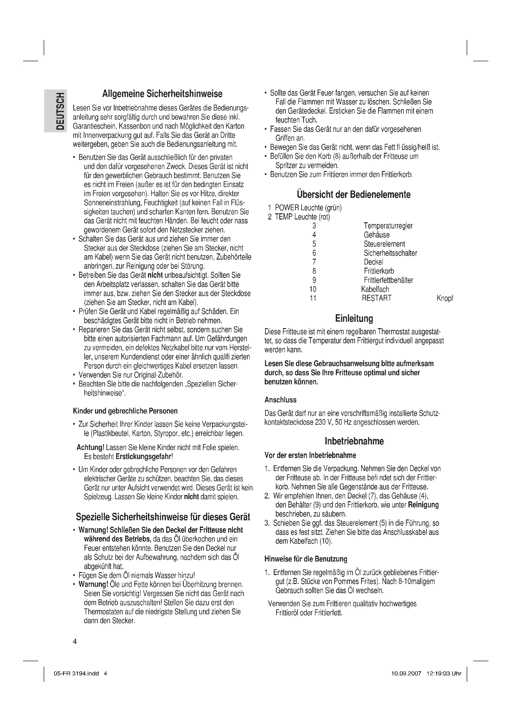 - Benutzen Sie zum Frittieren immer den Frittierkorb. Übersicht der Bedienelemente 1 POWER Leuchte (grün) 2 TEMP Leuchte (rot) 3 Temperaturregler 4 Gehäuse 5 Steuerelement 6 Sicherheitsschalter 7 Deckel 8 Frittierkorb 9 Frittierfettbehälter 10 Kabelfach 11 RESTART Knopf Einleitung Diese Fritteuse ist mit einem regelbaren Thermostat ausgestat- tet, so dass die Temperatur dem Frittiergut individuell angepasst werden kann. Lesen Sie diese Gebrauchsanweisung bitte aufmerksam durch, so dass Sie Ihre Fritteuse optimal und sicher benutzen können. Anschluss Das Gerät darf nur an eine vorschriftsmäßig installierte Schutz- kontaktsteckdose 230 V, 50 Hz angeschlossen werden. Inbetriebnahme Vor der ersten Inbetriebnahme