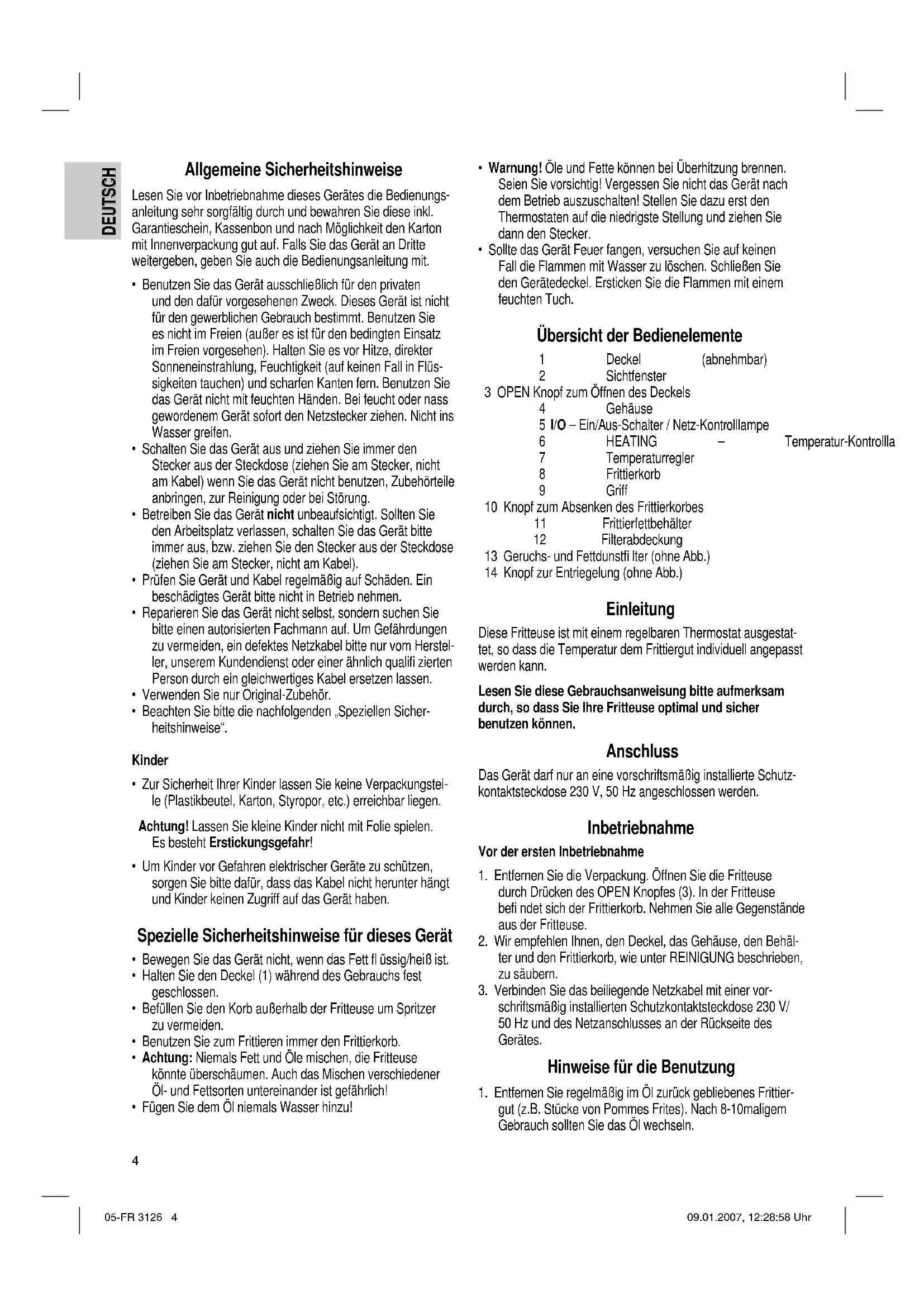 Обзор деталей прибора.............................................. стр. 3 Руководство по эксплуатации.................................... стр. 37 Технические данные................................................... стр. 39 Гарантия....................................................................... стр. 39 05-FR 3126 2 09.01.2007, 12:28:55 Uhr3 Übersicht der Bedienelemente Overzicht van de bedieningselementen • Liste des différents éléments de commande Indicación de los elementos de manejo • Descrição dos elementos • Elementi di comando Oversikt over betjeningselementene • Overview of the Components Przegląd elementów obsługi • Přehled ovládacích prvků • A kezelőelemek áttekintése Обзор деталей прибора 05-FR 3126 3 09.01.2007, 12:28:58 Uhr4 DEUTSCH DEUTSCH Allgemeine Sicherheitshinweise Lesen Sie vor Inbetriebnahme dieses Gerätes die Bedienungs- anleitung sehr sorgfältig durch und bewahren Sie diese inkl. Garantieschein, Kassenbon und nach Möglichkeit den Karton mit Innenverpackung gut auf. Falls Sie das Gerät an Dritte weitergeben, geben Sie auch die Bedienungsanleitung mit.