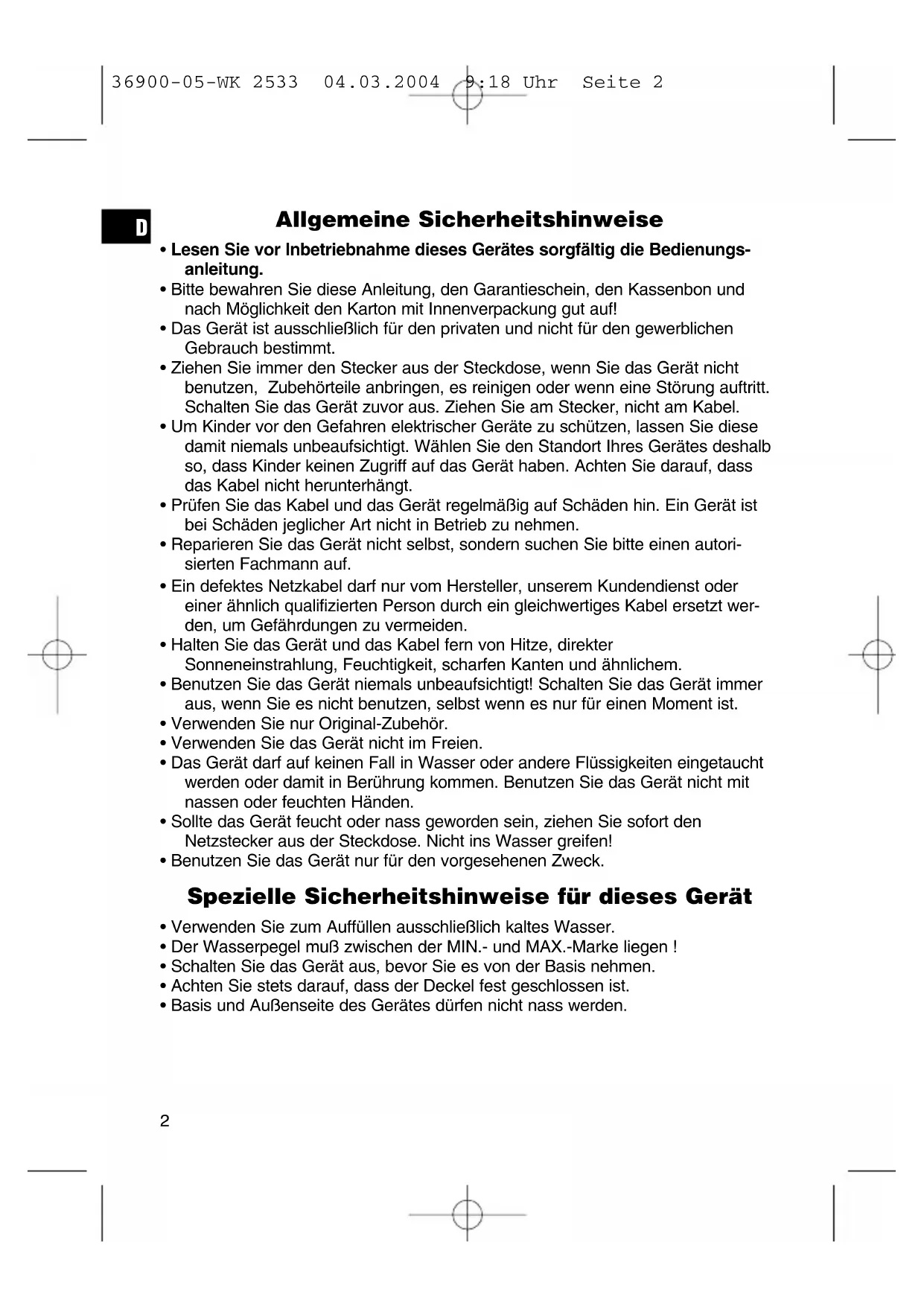 36900-05-WK 2533 04.03.2004 9:18 Uhr Seite 2Inbetriebnahme des Gerätes Kochen Sie vor der ersten Verwendung des Gerätes 2x mit frischem Wasser – ohne Zusatzmittel.
