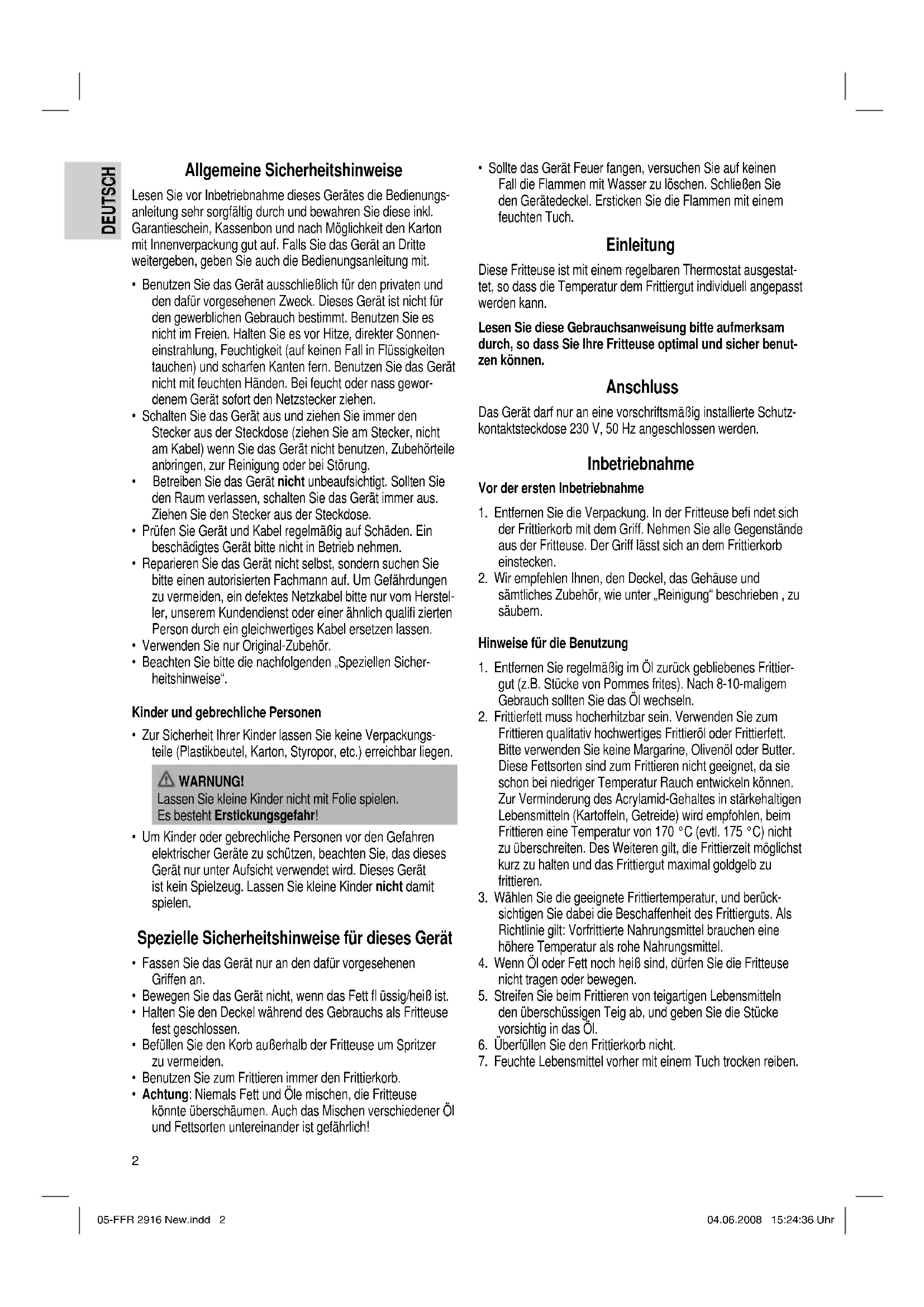 05-FFR 2916 New.indd 205-FFR 2916 New.indd 2 04.06.2008 15:24:36 Uhr04.06.2008 15:24:36 Uhr3 DEUTSCH DEUTSCH Benutzung des Gerätes Frittieren