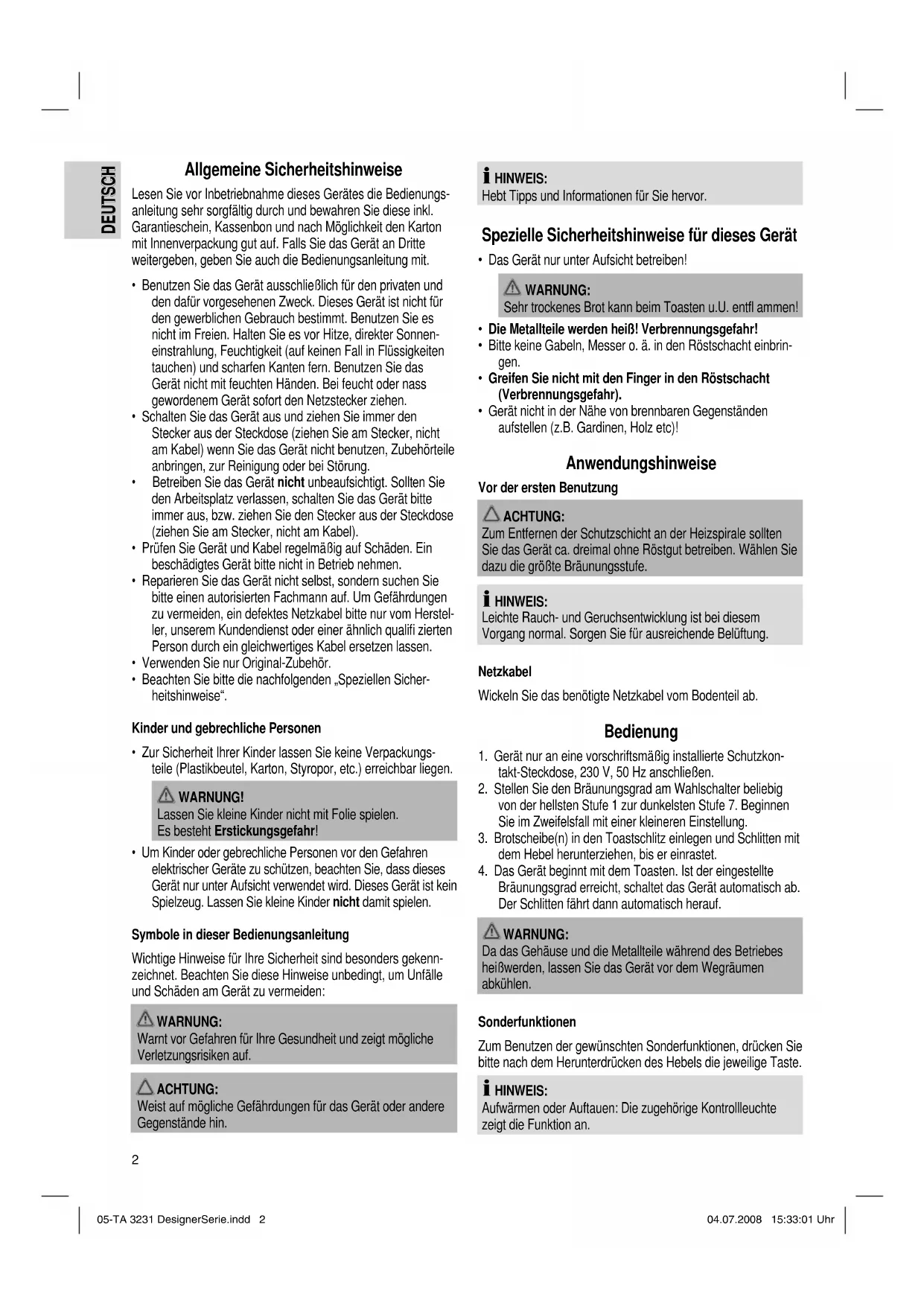 TA 3231 05-TA 3231 DesignerSerie.indd 105-TA 3231 DesignerSerie.indd 1 04.07.2008 15:32:53 Uhr04.07.2008 15:32:53 Uhr2 DEUTSCH DEUTSCH Allgemeine Sicherheitshinweise Lesen Sie vor Inbetriebnahme dieses Gerätes die Bedienungs- anleitung sehr sorgfältig durch und bewahren Sie diese inkl. Garantieschein, Kassenbon und nach Möglichkeit den Karton mit Innenverpackung gut auf. Falls Sie das Gerät an Dritte weitergeben, geben Sie auch die Bedienungsanleitung mit.