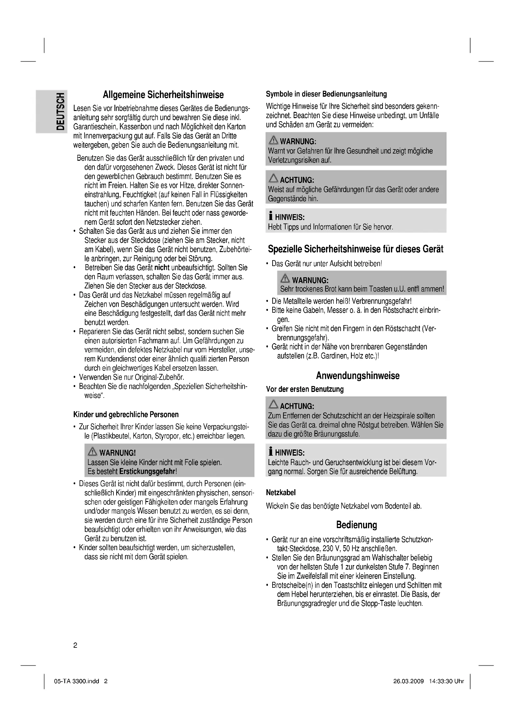 TA 3300 05-TA 3300.indd 105-TA 3300.indd 1 26.03.2009 14:33:21 Uhr26.03.2009 14:33:21 Uhr2 DEUTSCH DEUTSCH Allgemeine Sicherheitshinweise Lesen Sie vor Inbetriebnahme dieses Gerätes die Bedienungs- anleitung sehr sorgfältig durch und bewahren Sie diese inkl. Garantieschein, Kassenbon und nach Möglichkeit den Karton mit Innenverpackung gut auf. Falls Sie das Gerät an Dritte weitergeben, geben Sie auch die Bedienungsanleitung mit. Benutzen Sie das Gerät ausschließlich für den privaten und den dafür vorgesehenen Zweck. Dieses Gerät ist nicht für den gewerblichen Gebrauch bestimmt. Benutzen Sie es nicht im Freien. Halten Sie es vor Hitze, direkter Sonnen- einstrahlung, Feuchtigkeit (auf keinen Fall in Flüssigkeiten tauchen) und scharfen Kanten fern. Benutzen Sie das Gerät nicht mit feuchten Händen. Bei feucht oder nass geworde- nem Gerät sofort den Netzstecker ziehen.