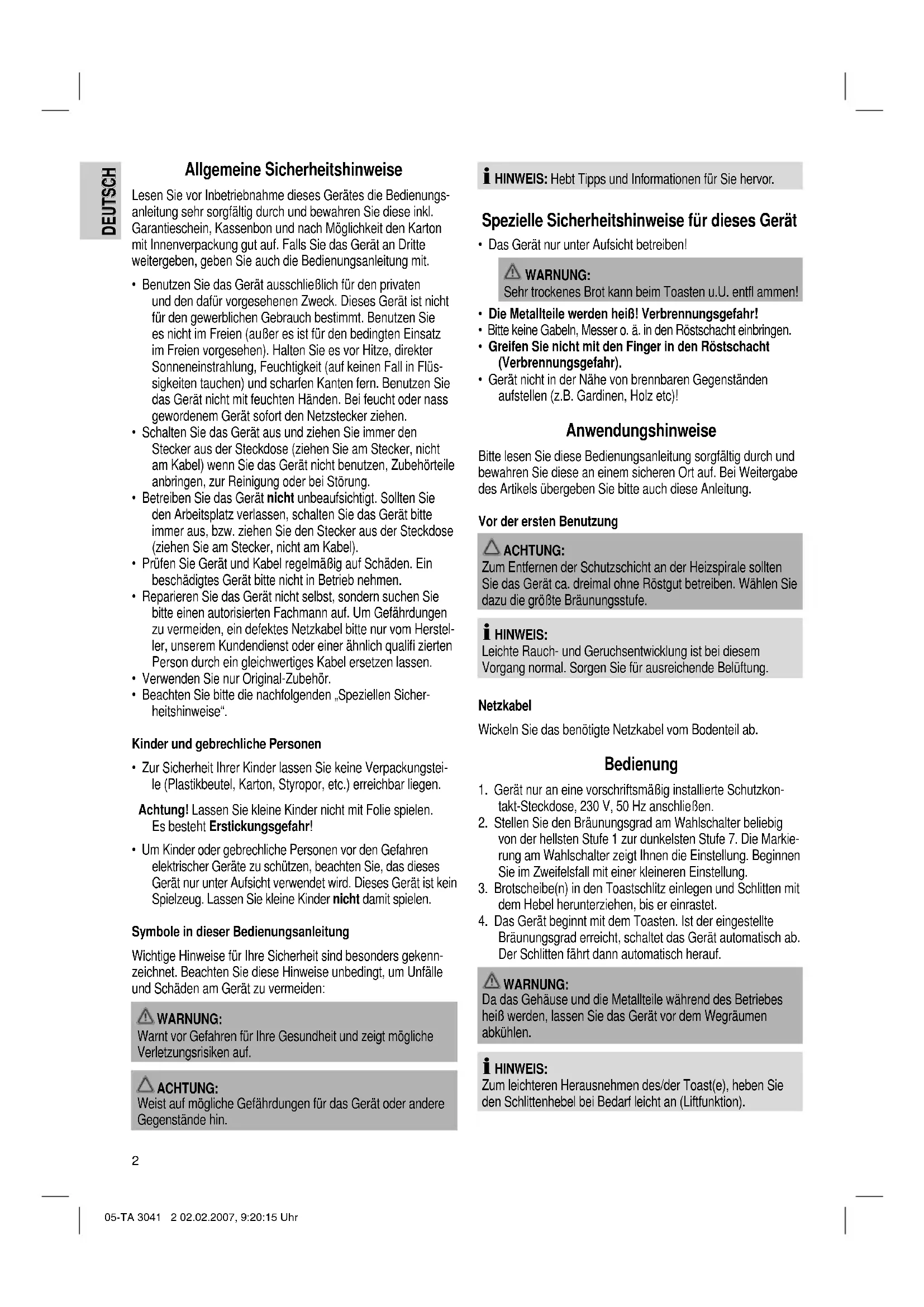 Bedienungsanleitung/Garantie Gebruiksaanwijzing/Garantie • Mode d’emploi/Garantie Instrucciones de servicio/Garantía • Manual de instruções/Garantia Istruzioni per l’uso/Garanzia • Bruksanvisning/Garanti Instruction Manual/Guarantee • Instrukcja obsługi/Gwarancja Návod k použití/Záruka • Használati utasítás/Garancia Руководство по эксплуатации/Гарантия TA 3041 05-TA 3041 1 02.02.2007, 9:20:12 Uhr2 DEUTSCH DEUTSCH Allgemeine Sicherheitshinweise Lesen Sie vor Inbetriebnahme dieses Gerätes die Bedienungs- anleitung sehr sorgfältig durch und bewahren Sie diese inkl. Garantieschein, Kassenbon und nach Möglichkeit den Karton mit Innenverpackung gut auf. Falls Sie das Gerät an Dritte weitergeben, geben Sie auch die Bedienungsanleitung mit.