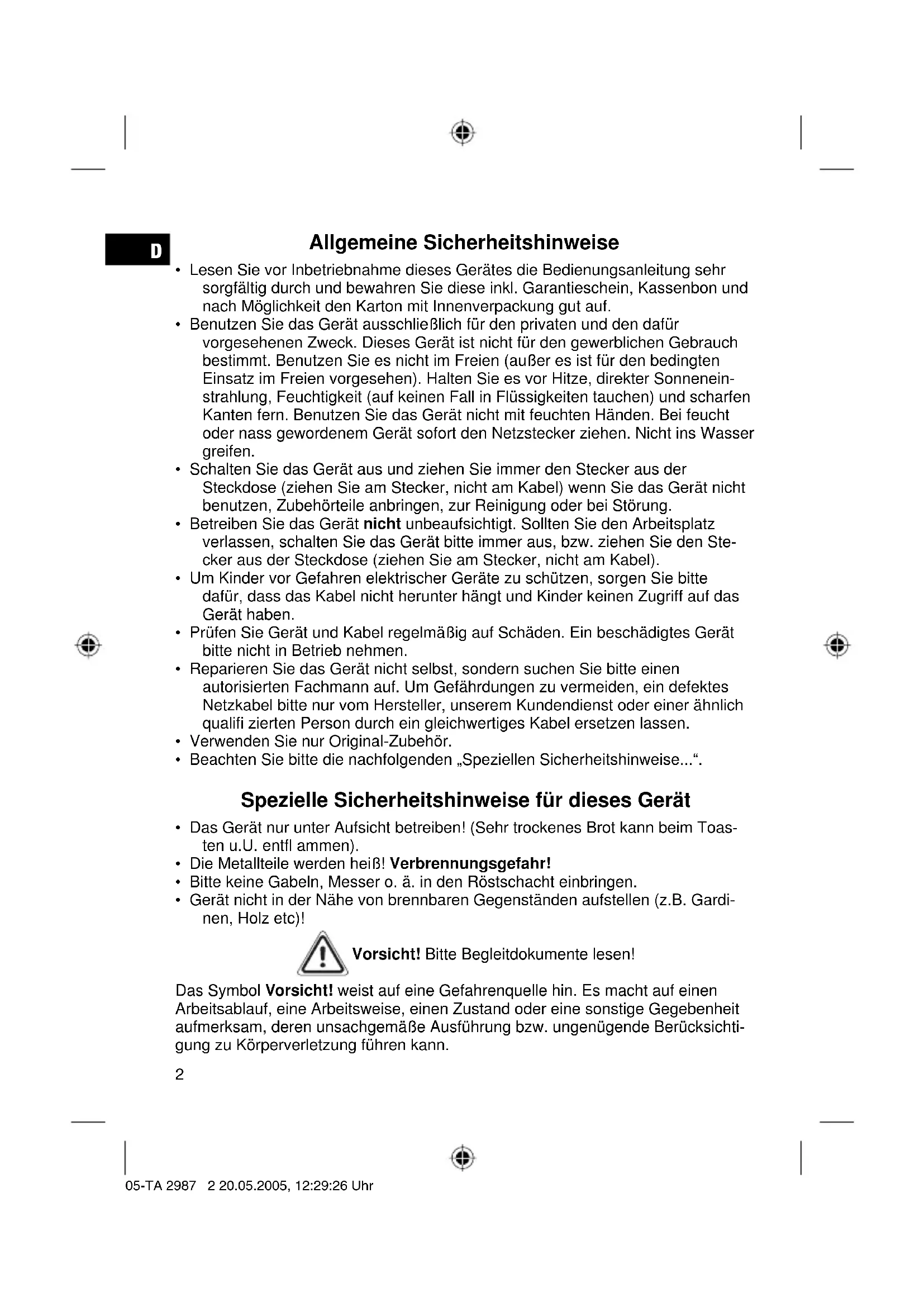 - Gerät nicht in der Nähe von brennbaren Gegenständen aufstellen (z.B. Gardi- nen, Holz etc)! Vorsicht! Bitte Begleitdokumente lesen! Das Symbol Vorsicht! weist auf eine Gefahrenquelle hin. Es macht auf einen Arbeitsablauf, eine Arbeitsweise, einen Zustand oder eine sonstige Gegebenheit aufmerksam, deren unsachgemäße Ausführung bzw. ungenügende Berücksichti- gung zu Körperverletzung führen kann. 05-TA 2987 2 20.05.2005, 12:29:26 UhrD