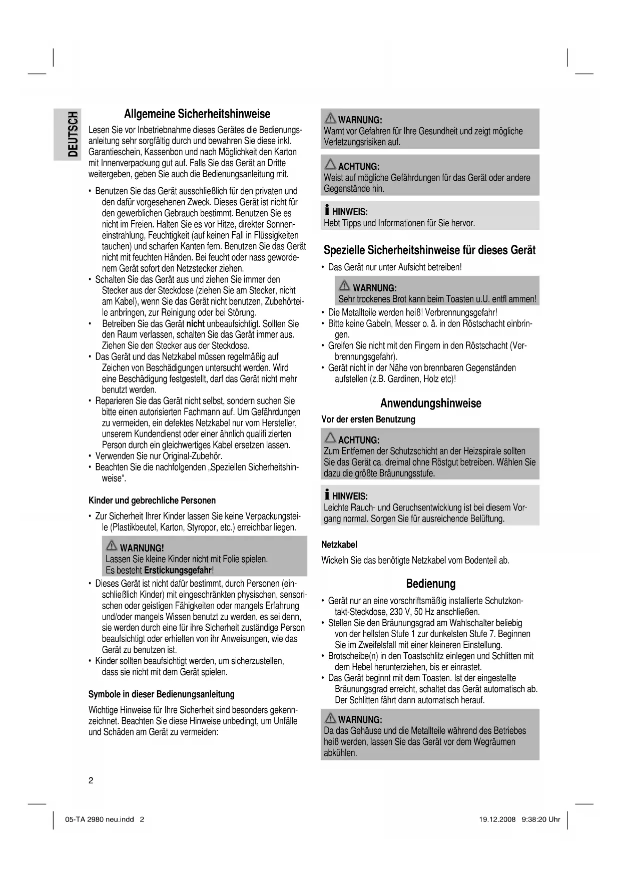05-TA 2980 neu.indd 105-TA 2980 neu.indd 1 19.12.2008 9:38:19 Uhr19.12.2008 9:38:19 Uhr2 DEUTSCH DEUTSCH Allgemeine Sicherheitshinweise Lesen Sie vor Inbetriebnahme dieses Gerätes die Bedienungs- anleitung sehr sorgfältig durch und bewahren Sie diese inkl. Garantieschein, Kassenbon und nach Möglichkeit den Karton mit Innenverpackung gut auf. Falls Sie das Gerät an Dritte weitergeben, geben Sie auch die Bedienungsanleitung mit.