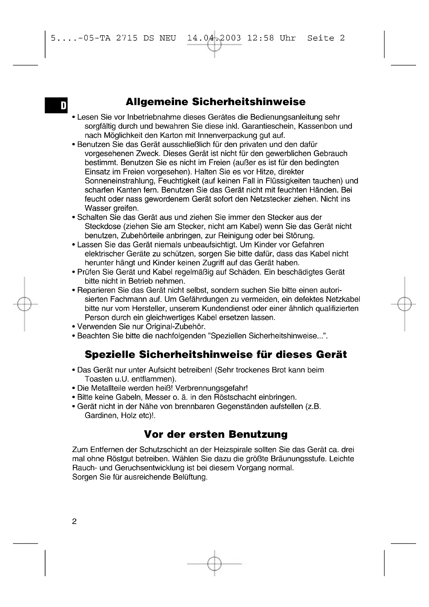 - Das Gerät nur unter Aufsicht betreiben! (Sehr trockenes Brot kann beim Toasten u.U. entflammen).
