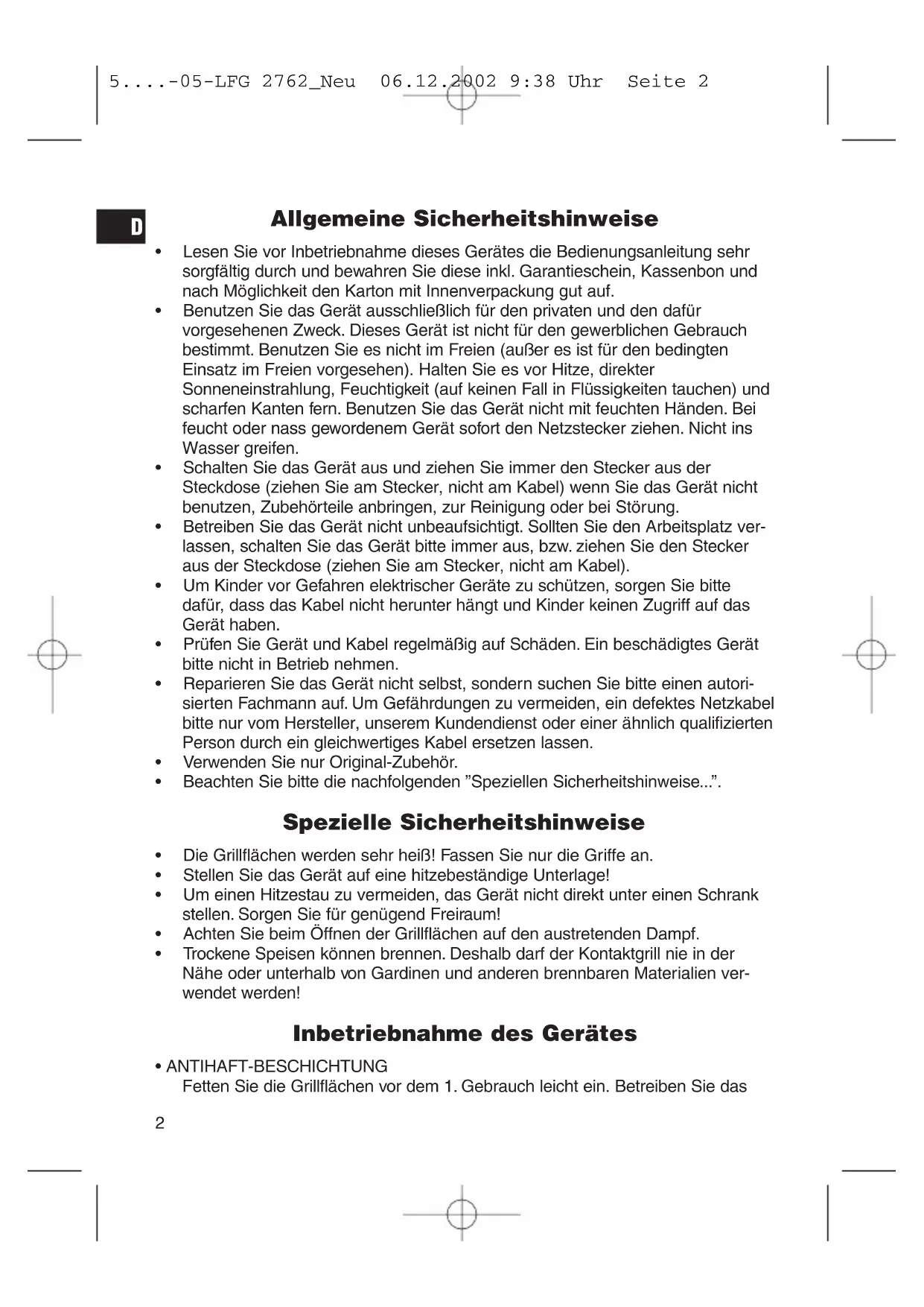 5....-05-LFG 2762_Neu 06.12.2002 9:38 Uhr Seite 2Gerät mit geschlossenen Grillflächen ca. 10 Minuten ohne Grillgut (siehe Benutzung des Gerätes). Danach mit einem feuchten Spültuch nachwischen. Benutzung des Gerätes