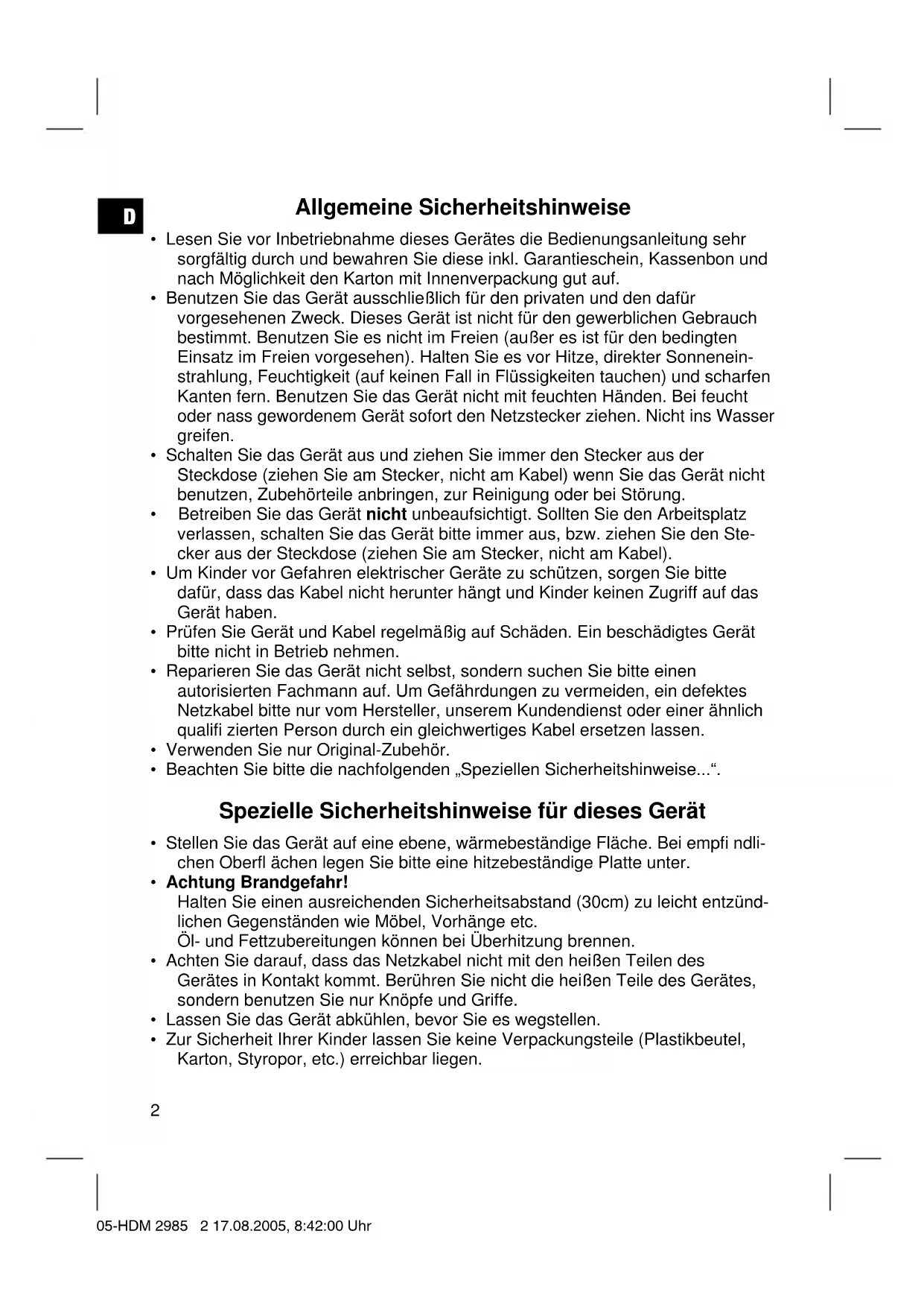 - Zur Sicherheit Ihrer Kinder lassen Sie keine Verpackungsteile (Plastikbeutel, Karton, Styropor, etc.) erreichbar liegen. 05-HDM 2985 2 17.08.2005, 8:42:00 UhrD